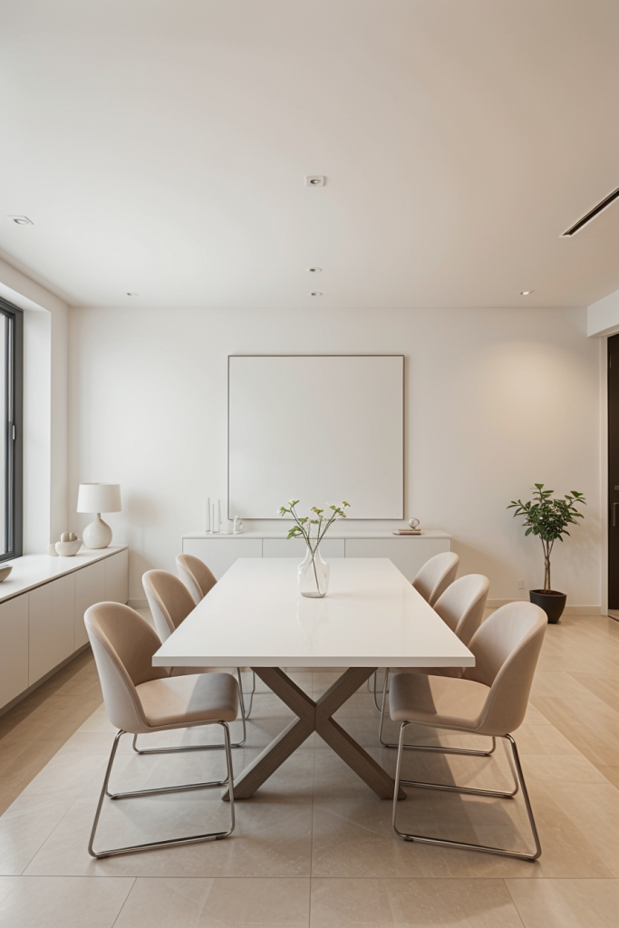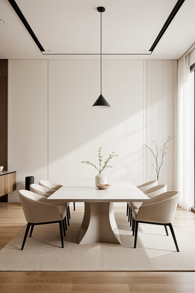Minimalism promotes quiet elegance and sophistication through the subtle use of colour, form, and texture. The atmosphere is serene with exquisite details combined in an unparalleled display of charm. With quality taking precedence over quantity, the dining room centerpiece and decor showcases the beauty of simplicity. A few thoughtfully selected decorative pieces are used as focal points within the space that brings calm to the interior.