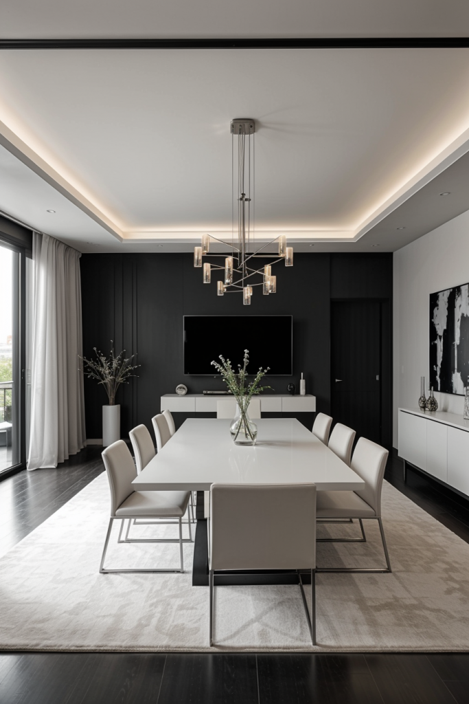 Immerse yourself in the striking fusion of shadows and highlights from modern dining room designs that are elegant, yet impactful. This particular style blends dark accent walls with white furniture, metals, and lighting which emphasize the room’s structure. The strong colors in combination with minimalistic decor ensures a stunning balance where the space is both inviting and dramatic.