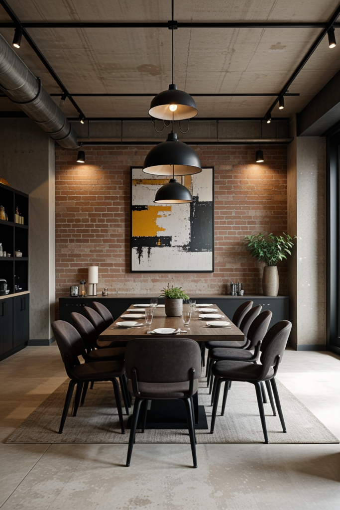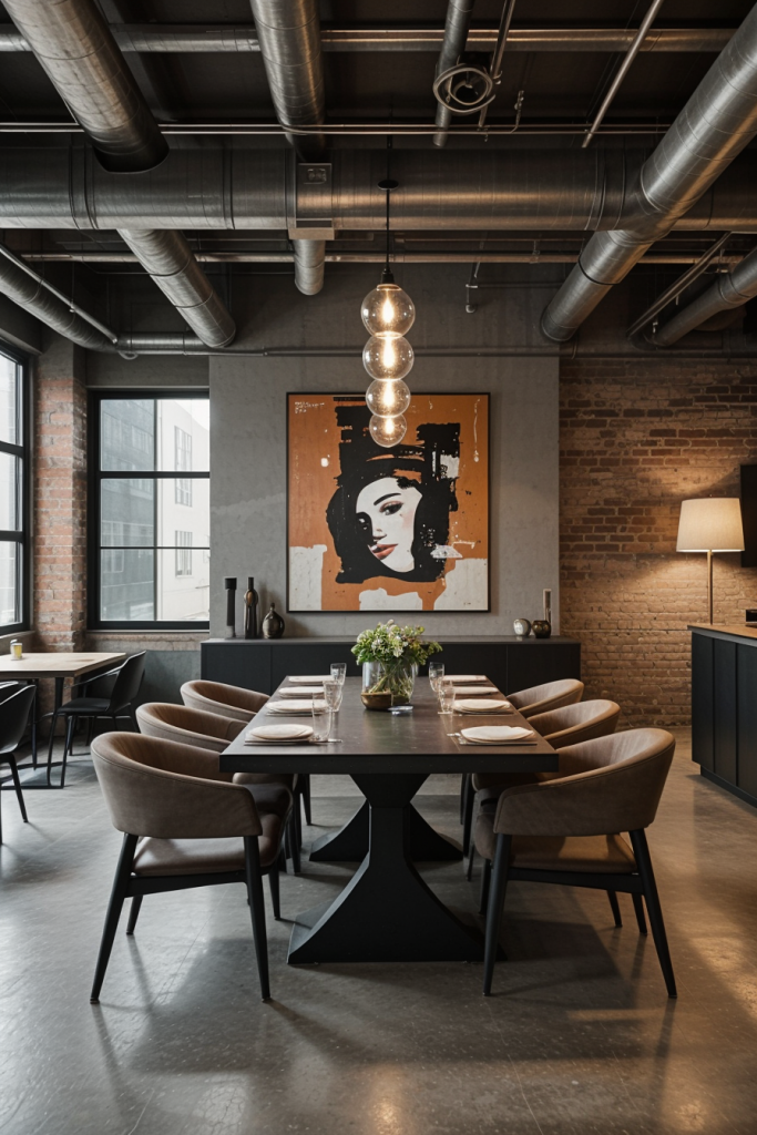 Explore the charm of contemporary dsigns alongside industrialism in urban residential dining rooms. This concept combines bare elements, modern illumination, and city-themed decorations to achieve a bold yet elegant ambiance. The intertwining of rough textures and smooth surfaces gives the room tailor-made conditions for modern cosmopolitan lifestyle.