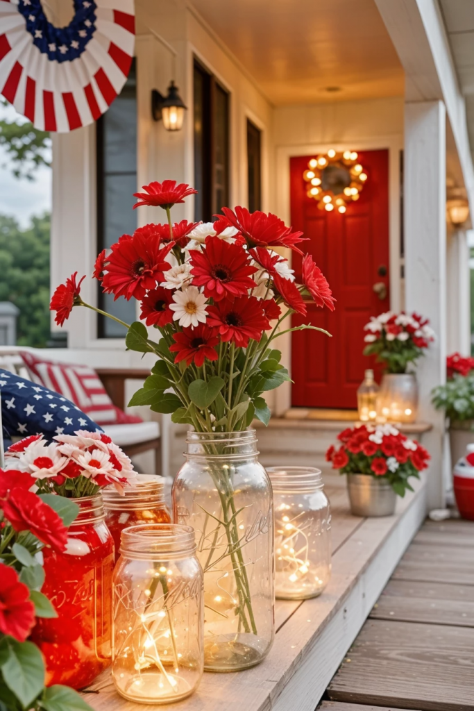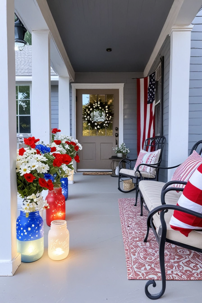 Decorating your porch with mason jars is easy and appealing because you can use them to create something unique for your home. If you decorate your porch with lights, paint the jars in flag colors or even use them as vases for small fresh flowers, they will look stunning and appealing. Putting these jars on tables, steps or even railings creates a glowing impression during the evening and adds warmth. Such details are quite easy to customize and turn any decor into personalized decor that looks festive.