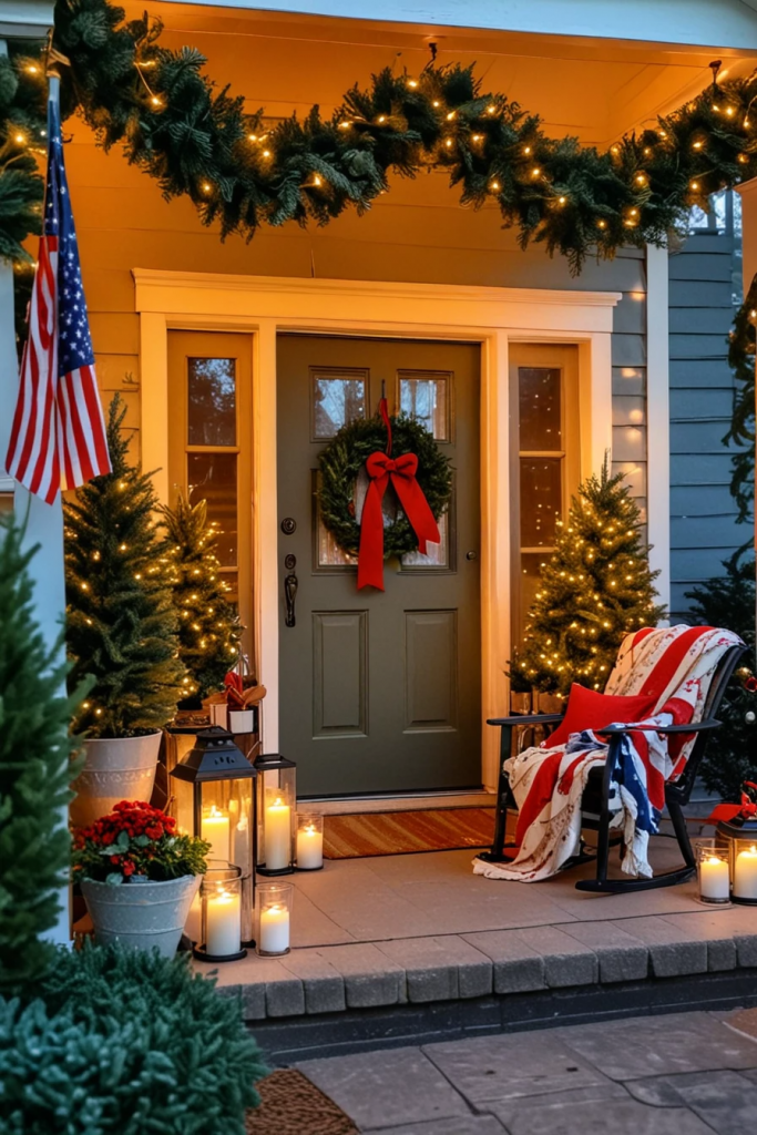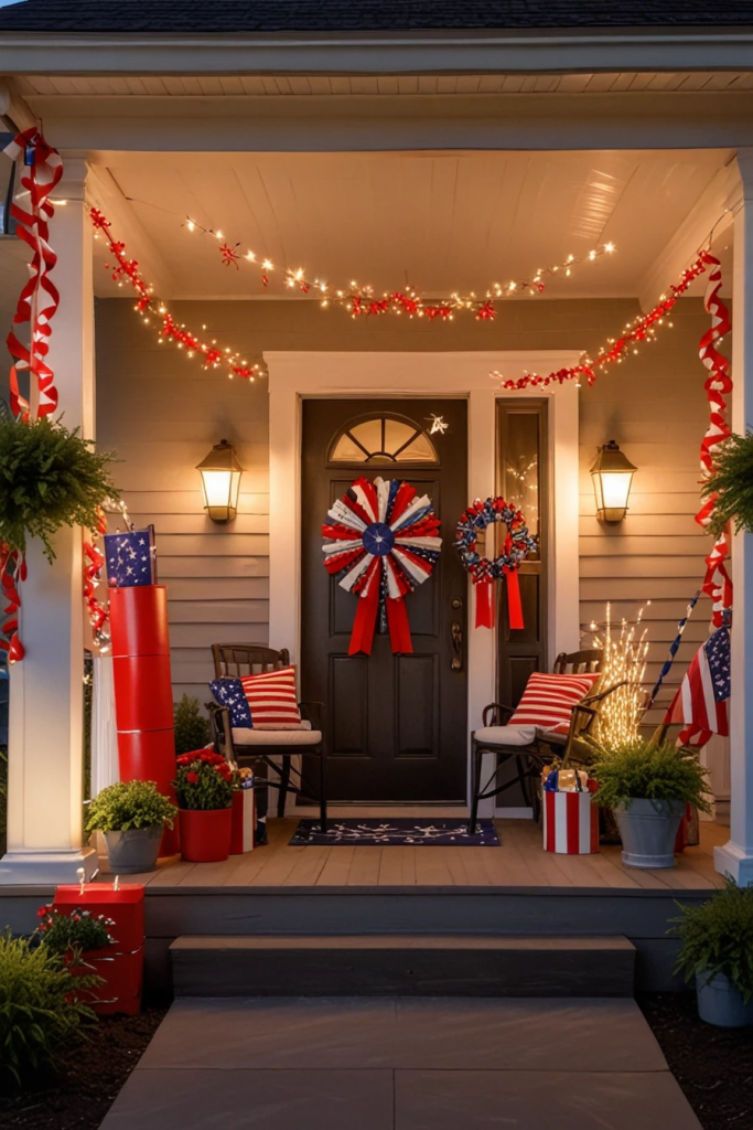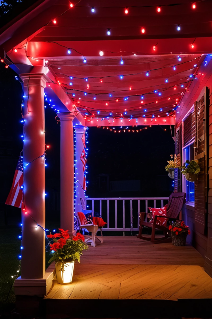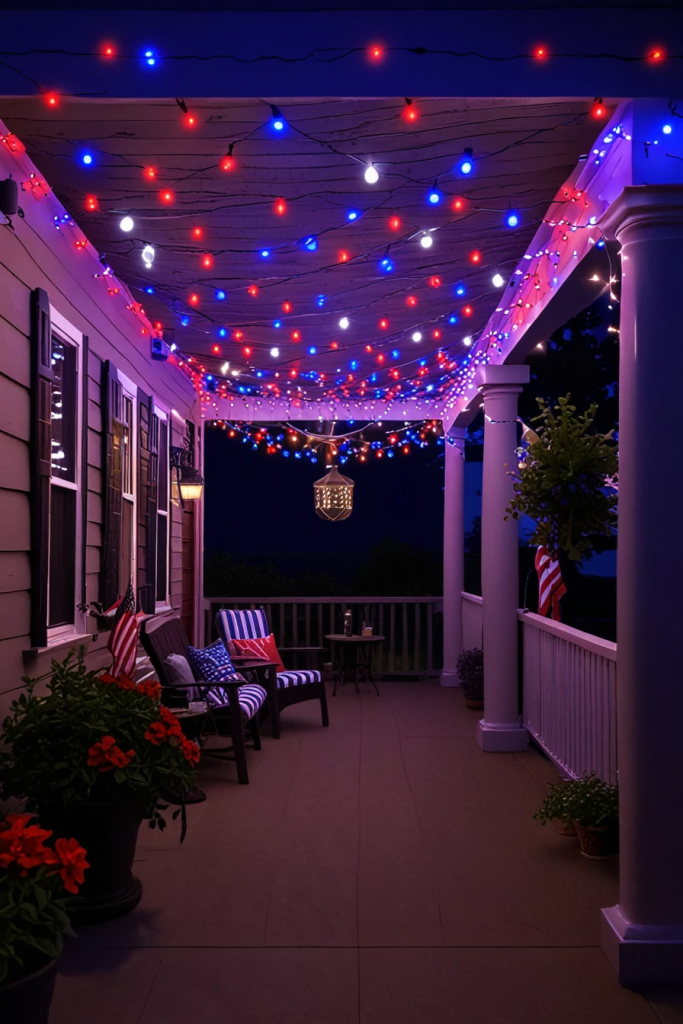 For a charming evening illumination, hang string lights in red, white, and blue colors along the ceiling beams or railing. Use globe, Edison, or twinkle bulbs depending on the desired atmosphere. These lights will transform your porch into a celebration space after dark, creating a festive canopy effect. This lighting element beautifully ties all the decor together.