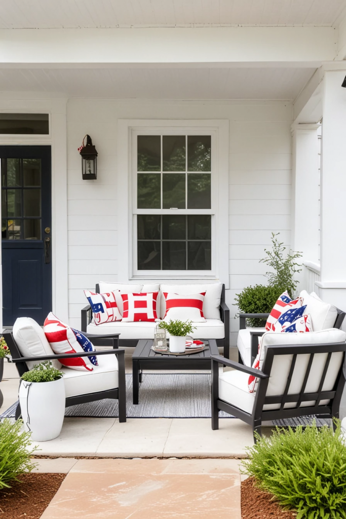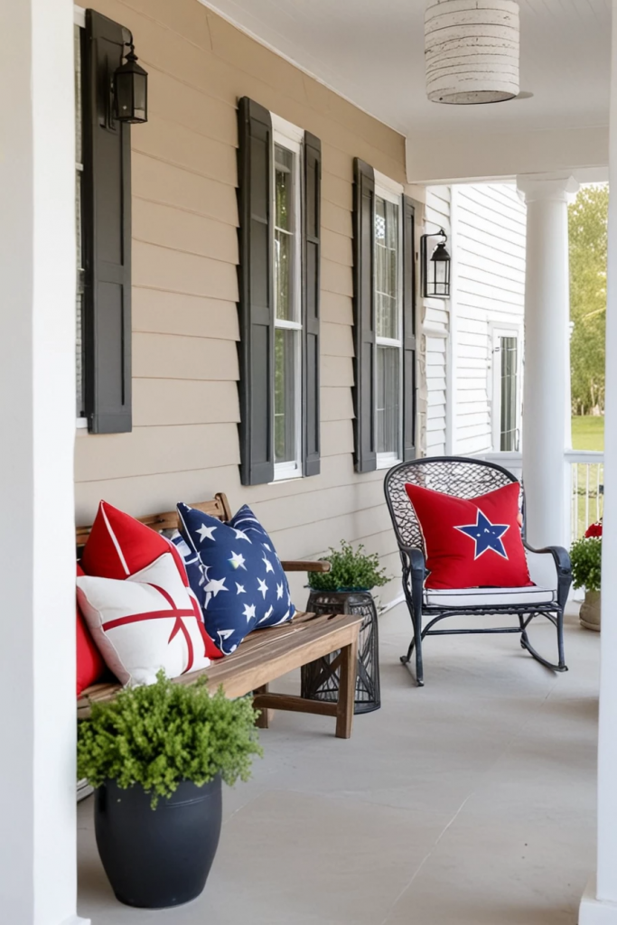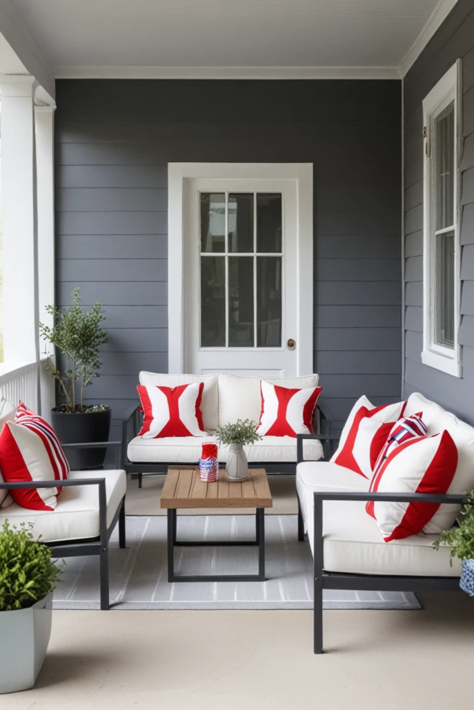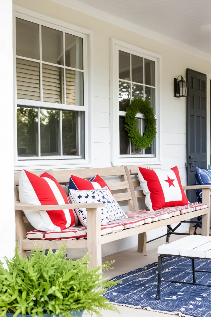 Make your porch seating more attractive by adding outdoor throw pillows in solid or star-spangled prints. For your chairs and benches, use bold weather-resistant fabrics made from durable materials. Blending patterns such as stripes with stars can be visually appealing while maintaining cohesion. If you are using rugs and tablecloths, make sure to coordinate them as well.