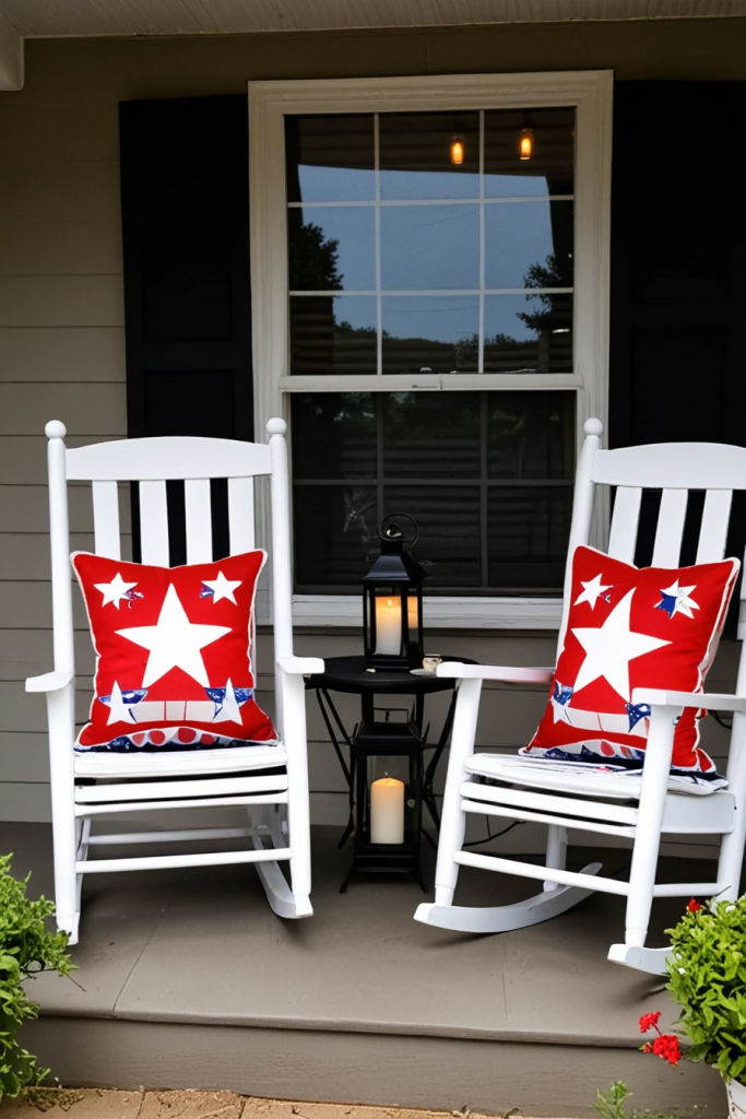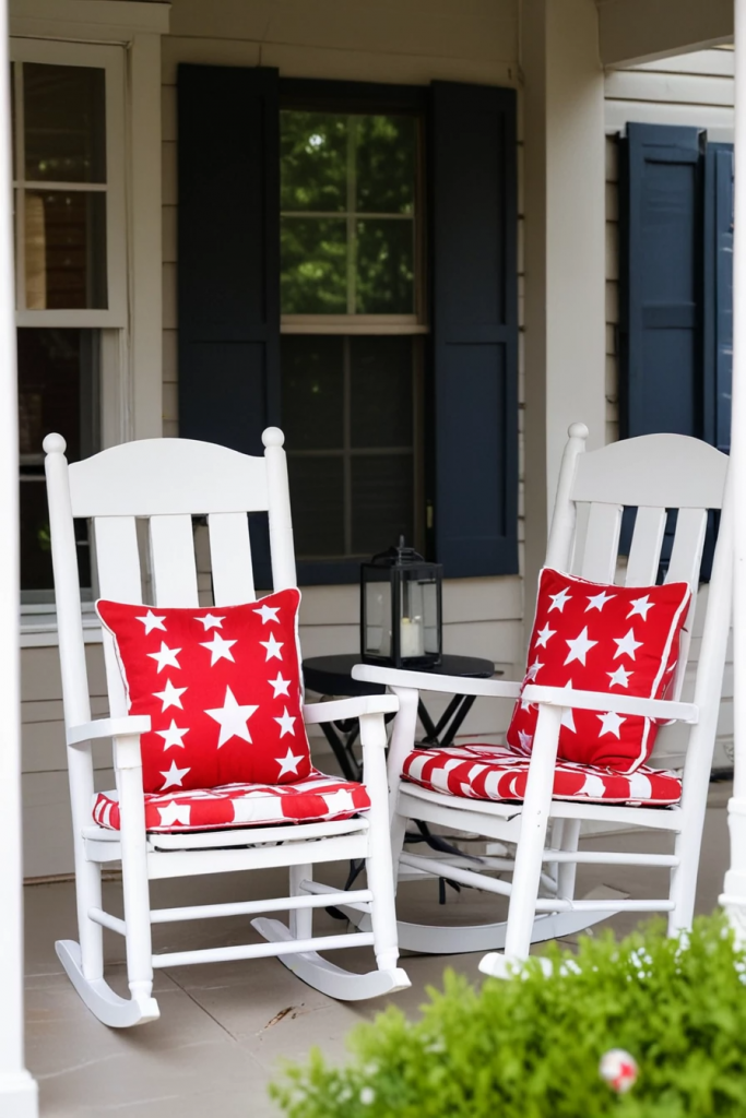 Classic rocking chairs are great for comfort and tradition on 4th of July! Pick white or navy chairs and pair them with festive holiday themed cushions that have stars or flags on them. This look is perfect for relaxing with a cool drink while watching fireworks from the porch. Add a small side table with themed coasters and a lantern for a cozy evening look.