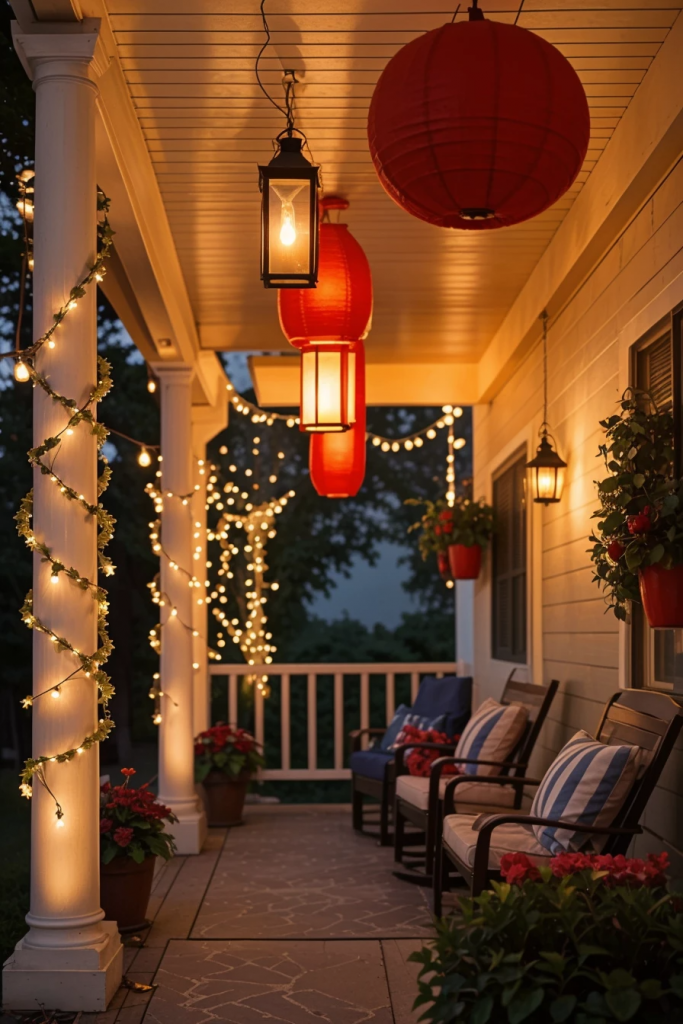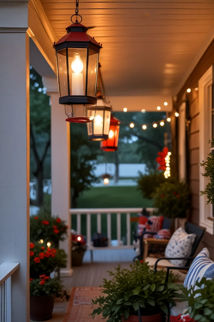 Elevate the festive mood with themed 4th of July lanterns in red, blue, and white. For ease of use, opt for battery-operated or solar-powered lanterns. Place them around the porch ceiling or along the beams in rows. Complete the setup with flag-themed string lights for a unified nighttime glow. These decorations add style and warmth to evening get-togethers.