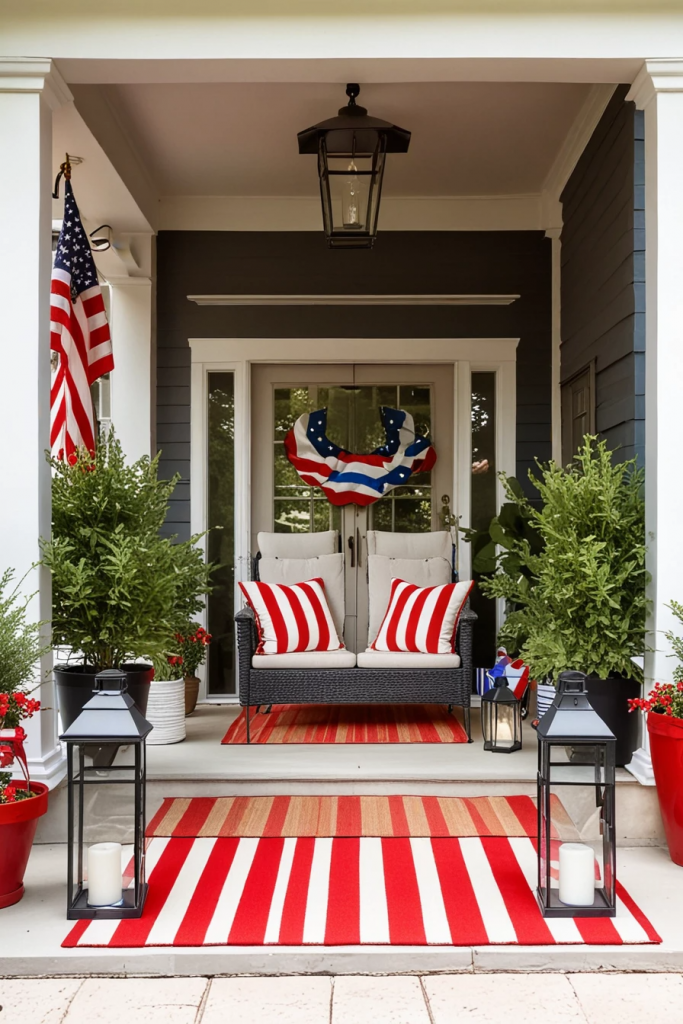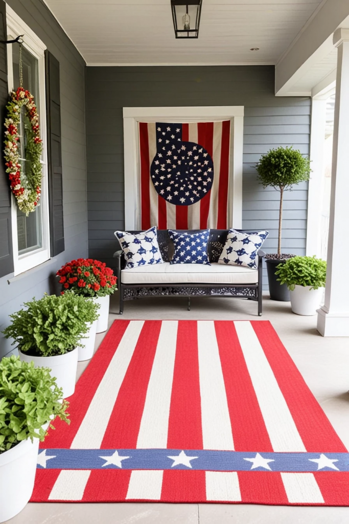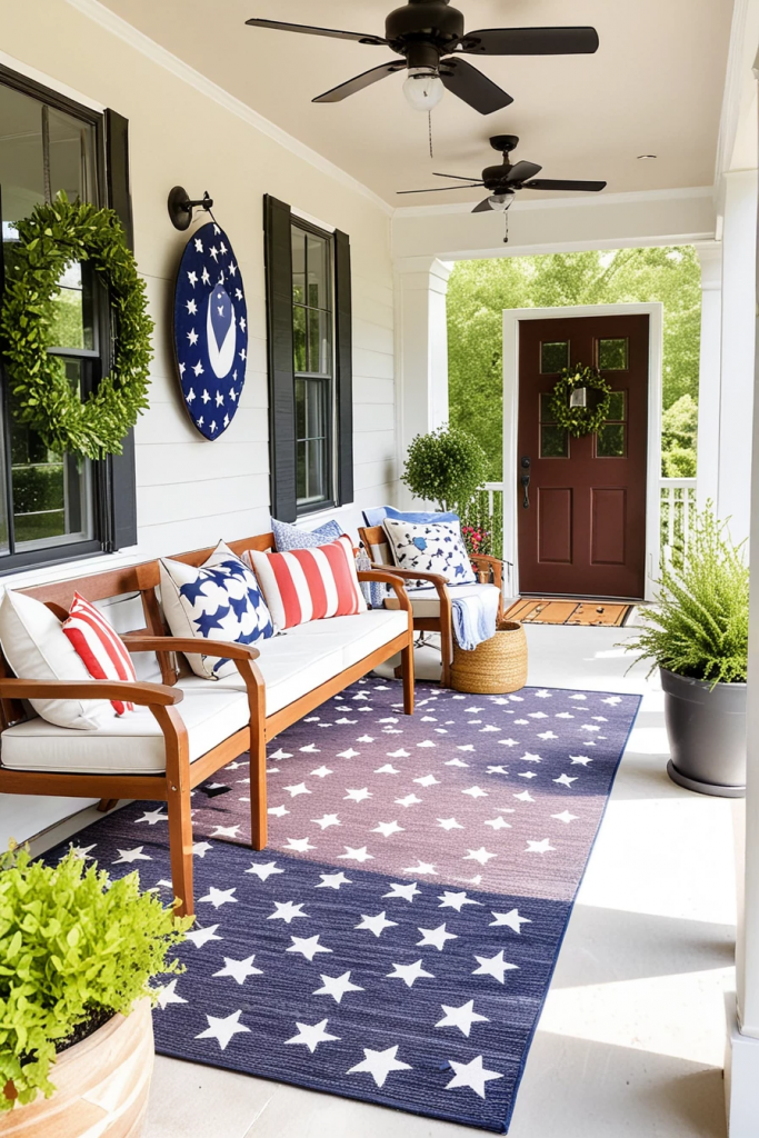 A vibrant outdoor rug can instantly change the mood of your porch decor. Explore designs that have a more modern approach to flag motifs like stars and stripes. Position the rug under a bench or seating area to create a defined space. Silhouette accessories should be used to balance the composition while still making the rug stand out as the centerpiece.