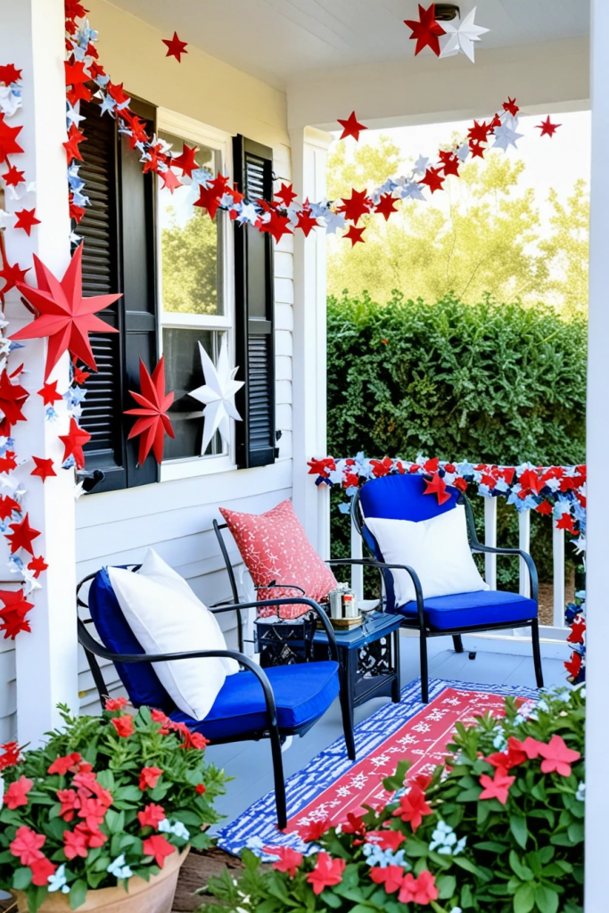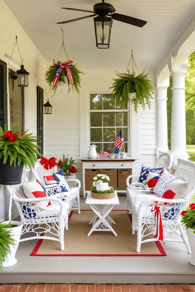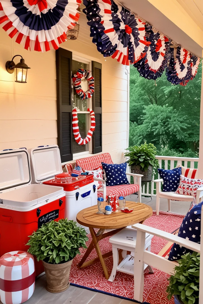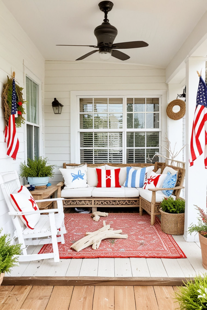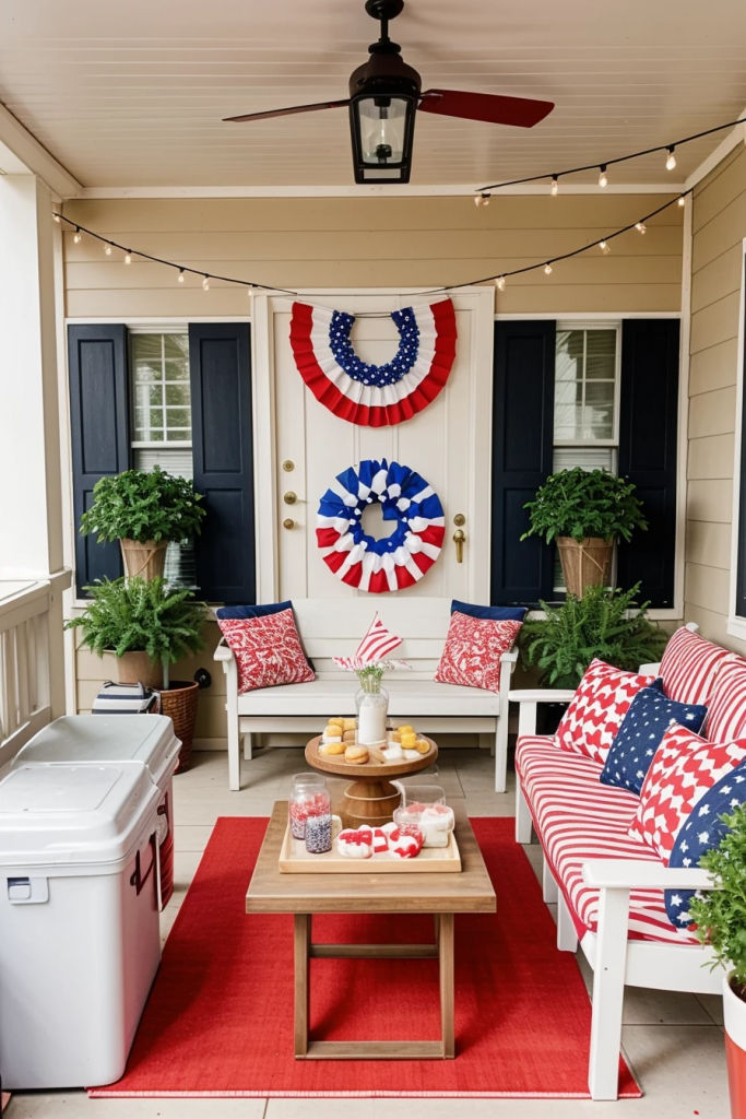 Begin your Independence Day makeover by adding cohesive patriotic decorations to your porch. For your Independence Day portrayal, balance bright reds, whites, and blues in congruent ratios while avoiding an overly festive appearance. Combine a striped outdoor rug with an American flag welcome mat and coordinate cushions and bunting to polish off the look. Integrate small potted flags, hanging stars, and lanterns to give the porch a celebratory feel. These decorations set the foundation for the rest of your porch styling.