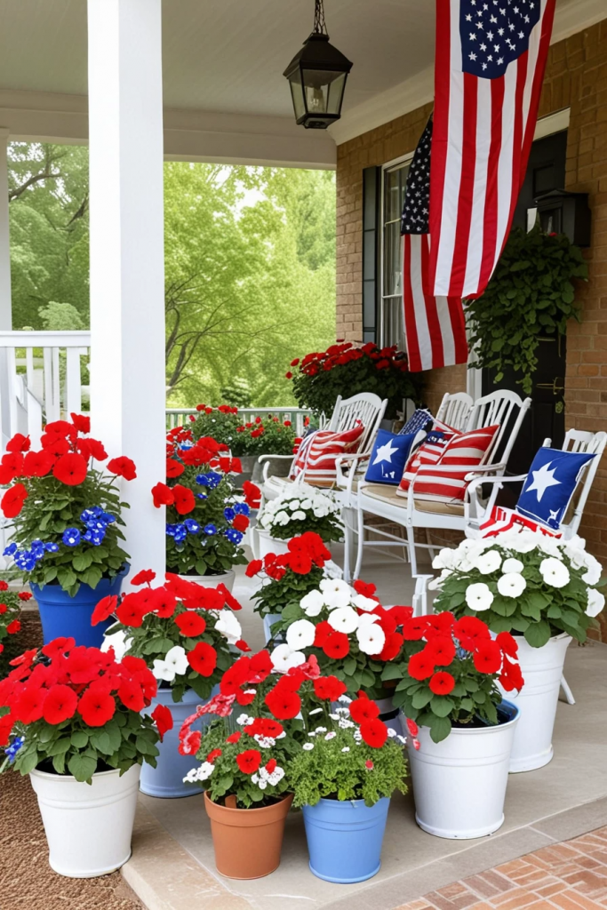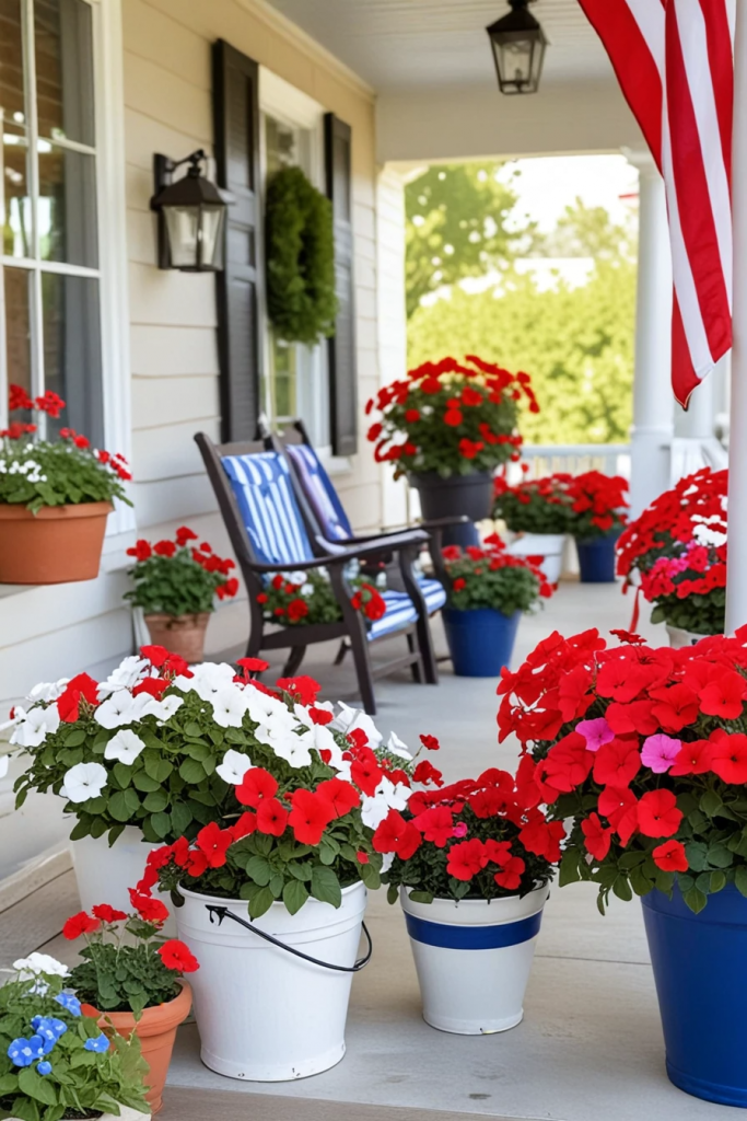 4th of July Porch Planters with Red, White, and Blue Blooms