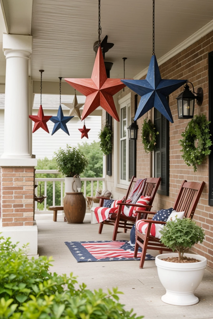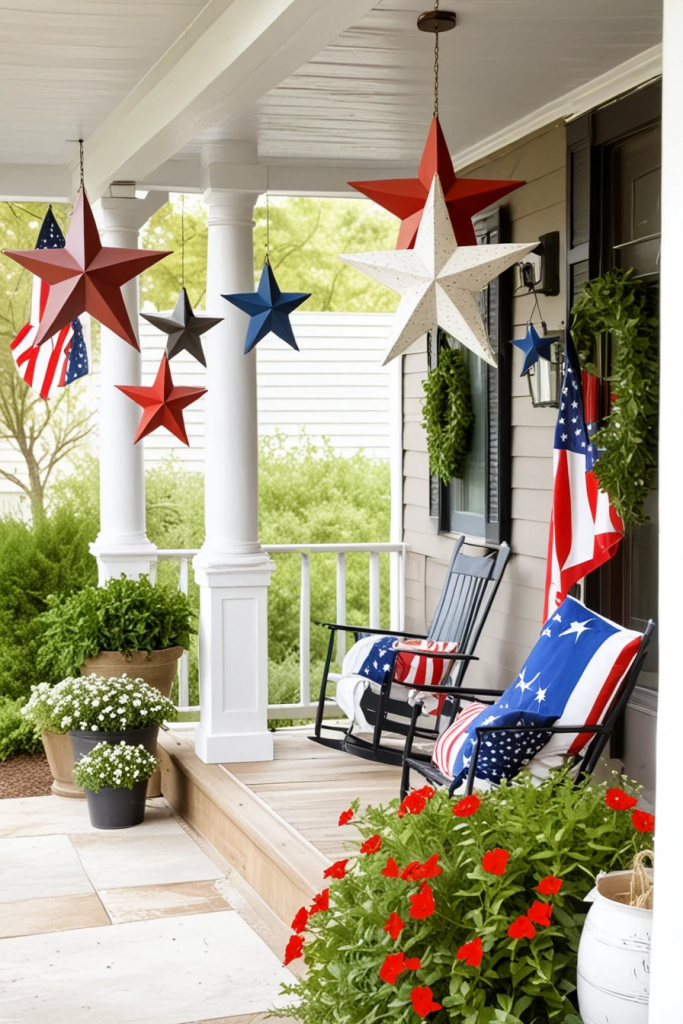 Consider incorporating wooden or metal stars to your porch as they are essential emblems of American pride. These symbols can be used to celebrate the stars and stripes, after all. There’s a ton of flexibility to their usage — place large wooden stars on walls or railings, scatter small metal stars on tables, or display a bundle of glittered stars in baskets or planters. Unsurprisingly, the craftsmanship can also range from rustic to glittery; they can be painted in patriotic colors or left untouched. Stars add texture AND a celebratory vibe to the space.