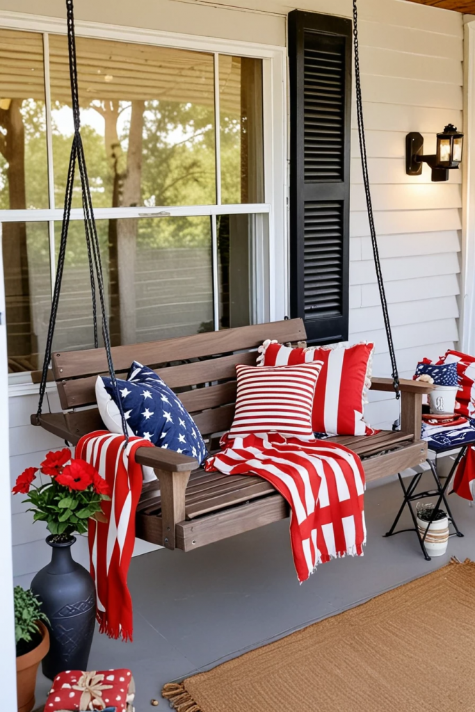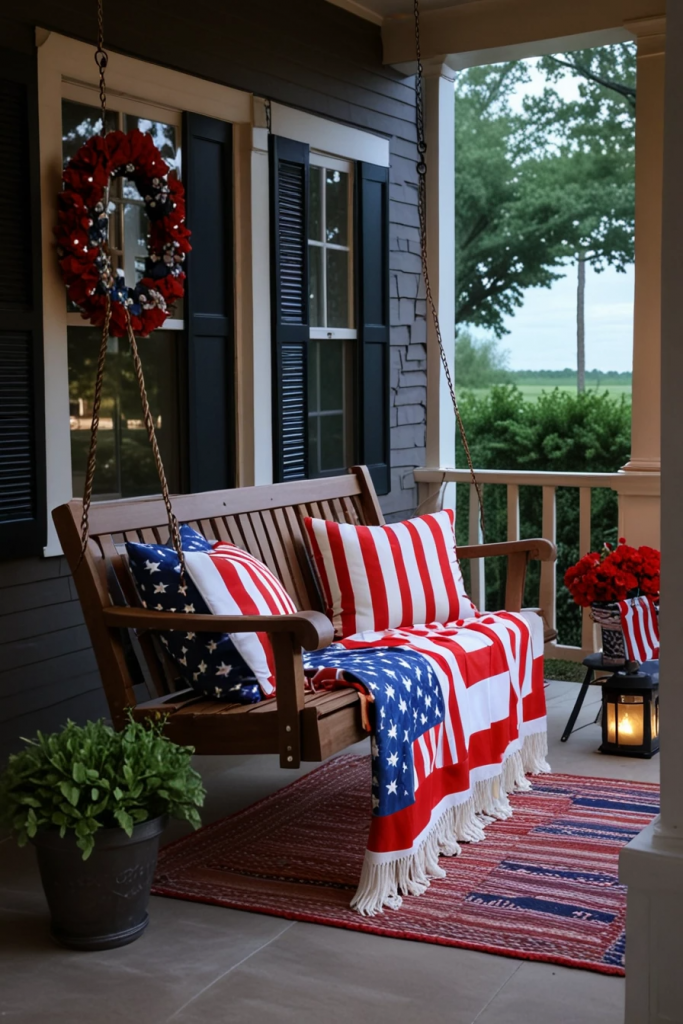 With a star-patterned lightweight blanket and a set of striped themed pillows, you can customize your porch swing into an elegant July fourth getaway. Place an iced tea pitcher on the side table with flag themed coasters for the complete effect. For a finishing touch, hang flag themed banners above the swing to make the porch swing look even more majestic. This spot is ideal for watching the summer breeze or fireworks.