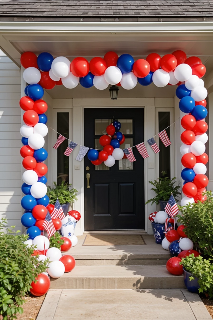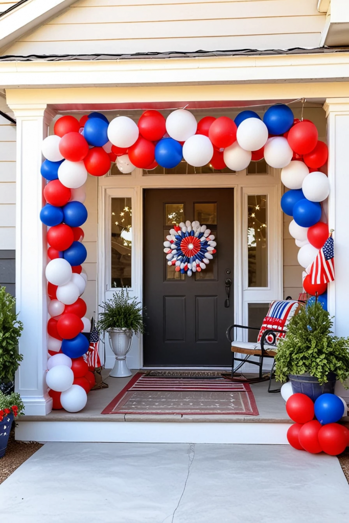 Elevate your celebration with a balloon garland in patriotic colors. Incorporate red, white, and blue in varying sizes and finishes – matte, glossy, and metallic. The garland can be placed over the doorframe, across the railing, or around the porch swing. Incorporating a few star-shaped balloons or miniature flags within the garland will enhance its festive appeal.