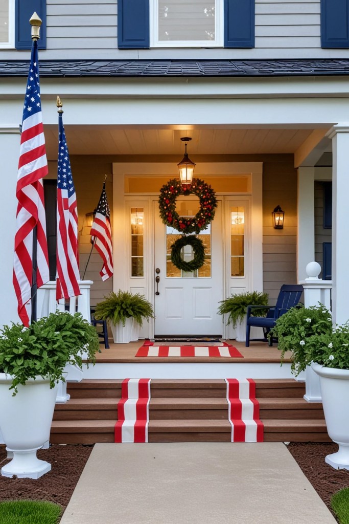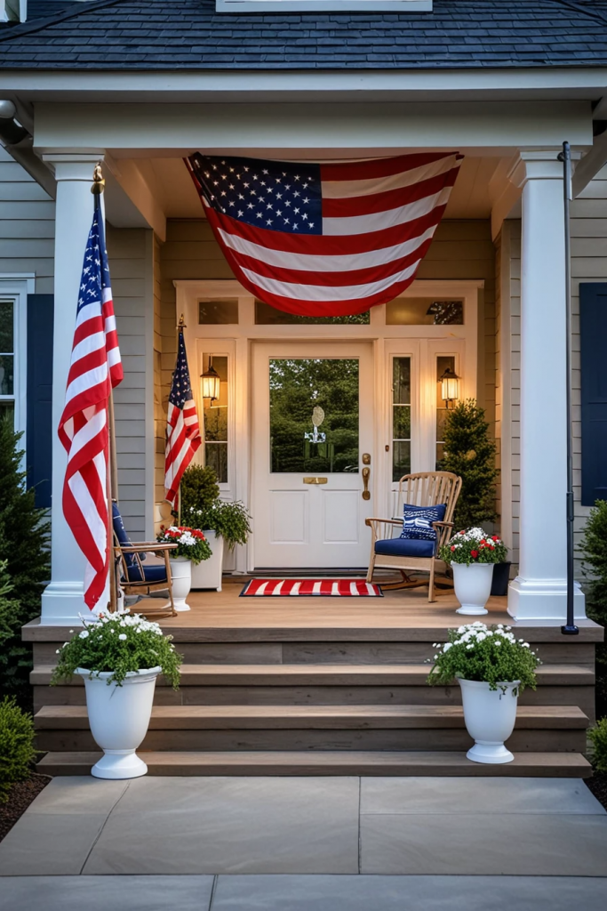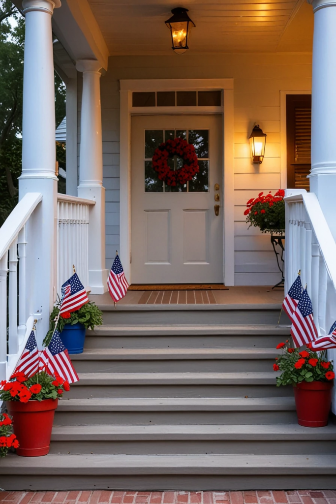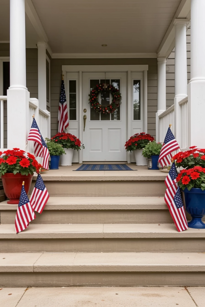 Place American flags of different sizes on the front porch steps or entryway for an attention grabbing yet friendly decor. Large flag poles on either side of the door serve as an eye-catching entry flanked by smaller flags in flower pots which add a delightful touch. Mix this with classic white planters and navy blue furniture to achieve a stunning yet timeless decor. Colonial and craftsman style homes particularly benefit from this type of decor.