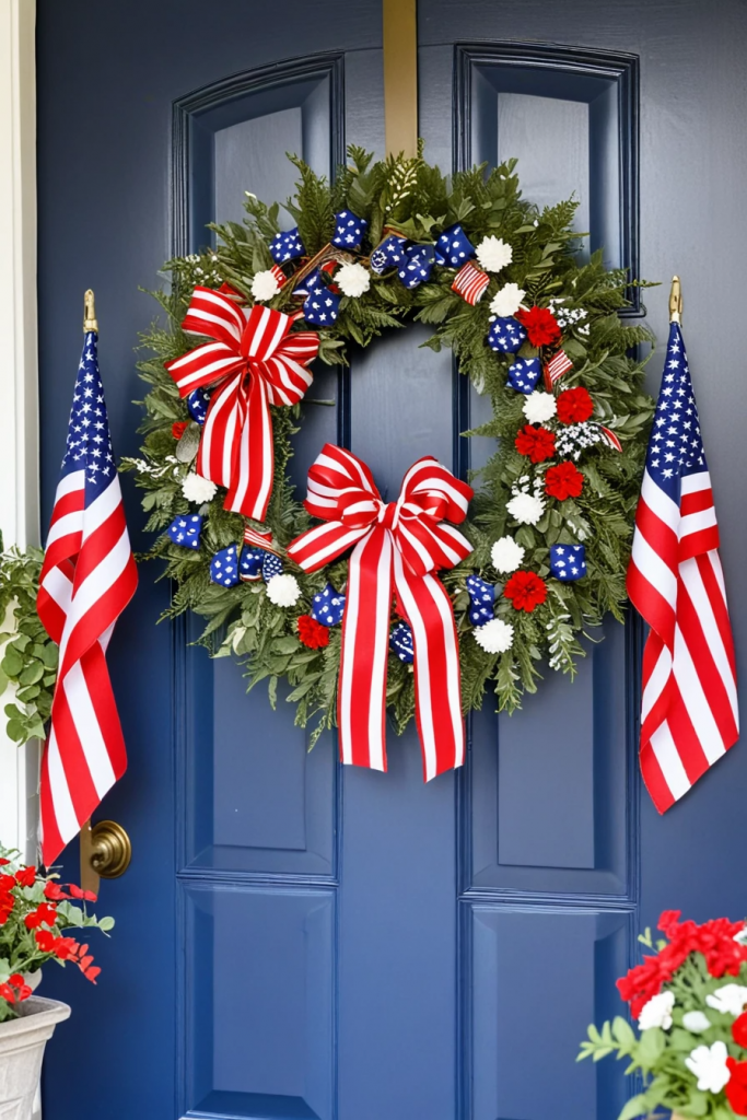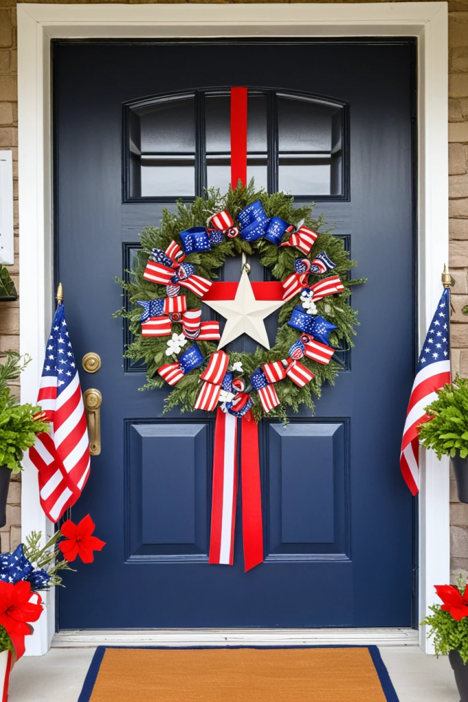 Add a new goal—highlight your entrance with a striking and animated 4th of July wreath. Ribbons, etars, and flags all come together to create symbols that one can use to make an animated wreath to decorate your door. Pick the one that fits best with your color scheme and match it with a painted door in white or deep navy for a touch of contrast. A wreath adds charm and decor to your porch which can look beautiful for the holidays.