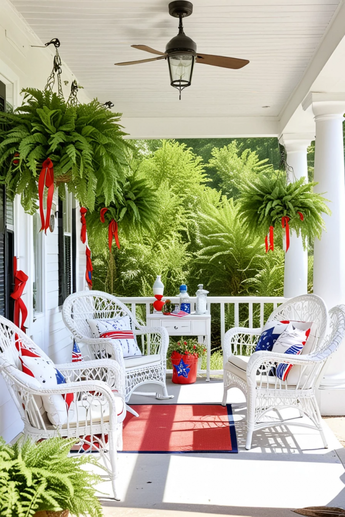 To capture the warm essence of the South, beautify your porch with traditional white wicker chairs, rocking benches, and hanging ferns. Add festive touches like patriotically themed ribbons wrapped around pots or railings and star/monogram embroidered pillows. Set a sweet tea dispenser on the porch alongside a fan basket, adding a friendly celebratory atmosphere while showcasing regional warmth and hospitality.
