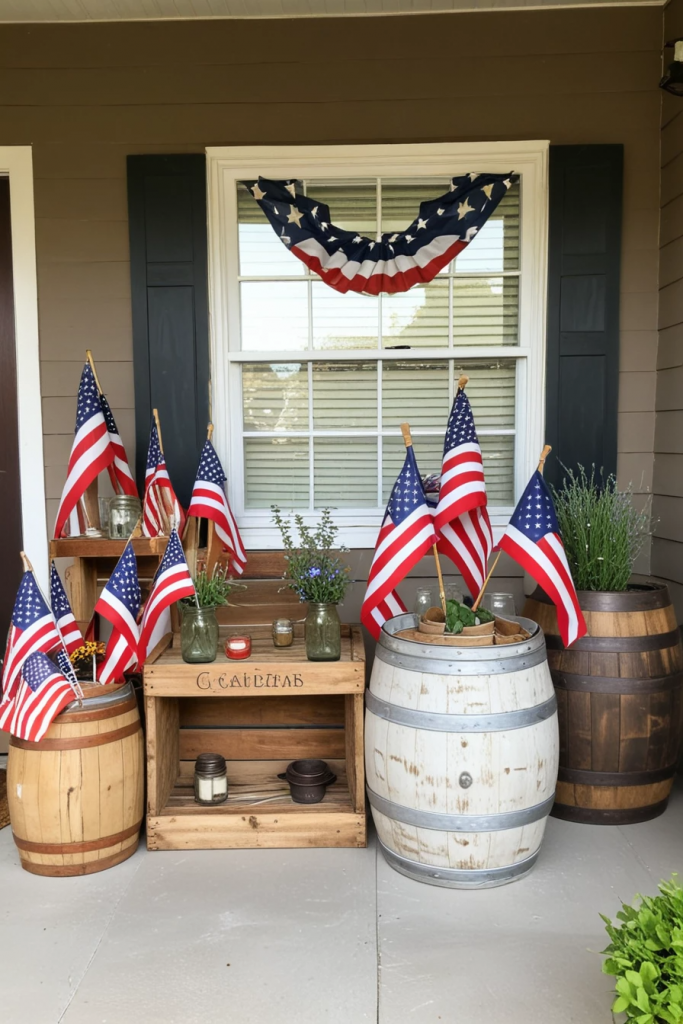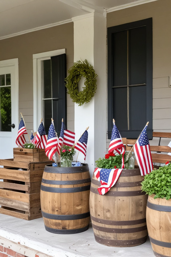 Enhance character and country charm by decorating with rustic crates and barrels. Fill wooden crates with old flags, mason jars, and lanterns and stack them for display. Use barrels as bases for flower pots or signs. The bold red, white, and blue colors pop but add a welcoming touch to personal plug. The barrels and crates aid in providing a warm contrast making it feel home like.