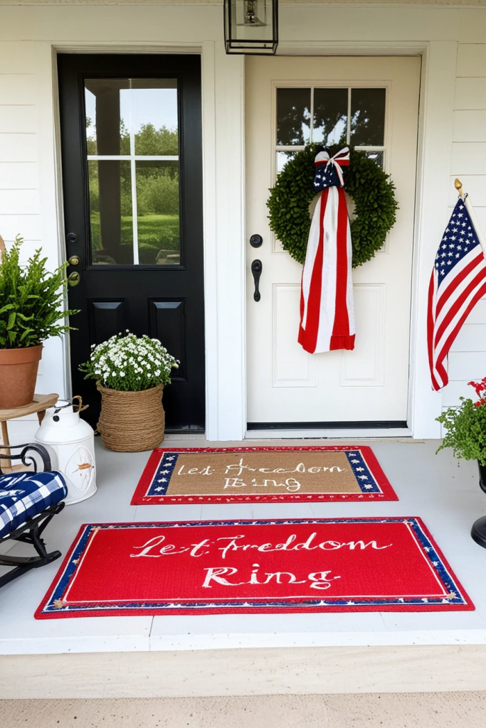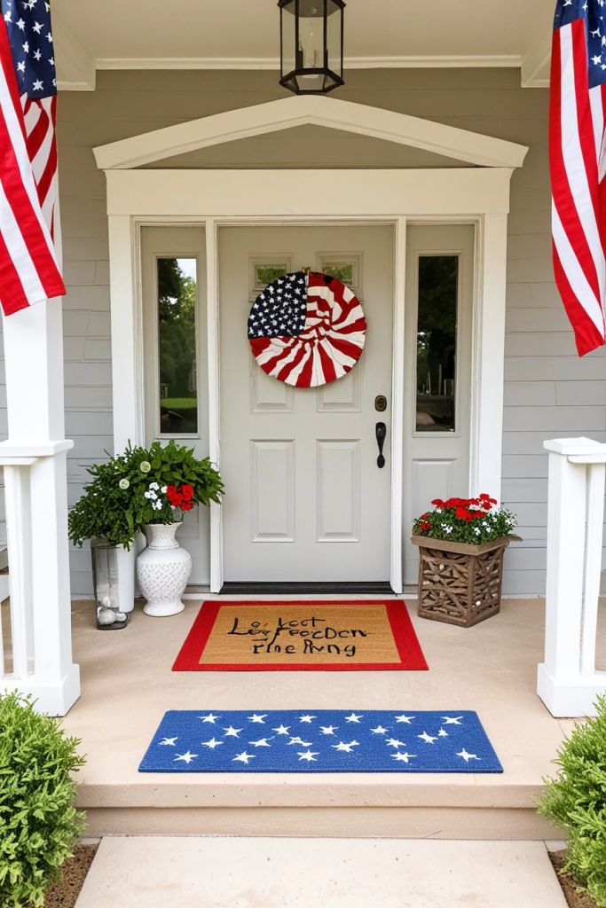 Spruce up your porch with layered doormats. Start with a large outdoor rug in red or blue tones and top it with a smaller mat featuring an Independence Day message like “Let Freedom Ring” or “Home of the Brave.” This layered look adds depth, enhances curb appeal, and helps your entryway’s polished state.