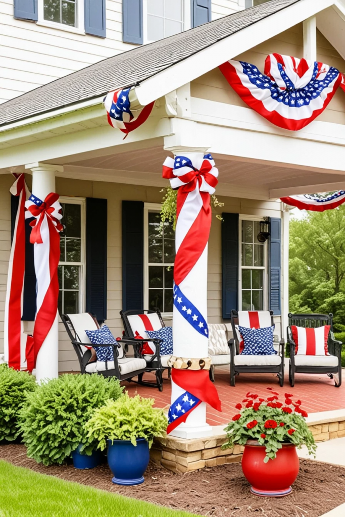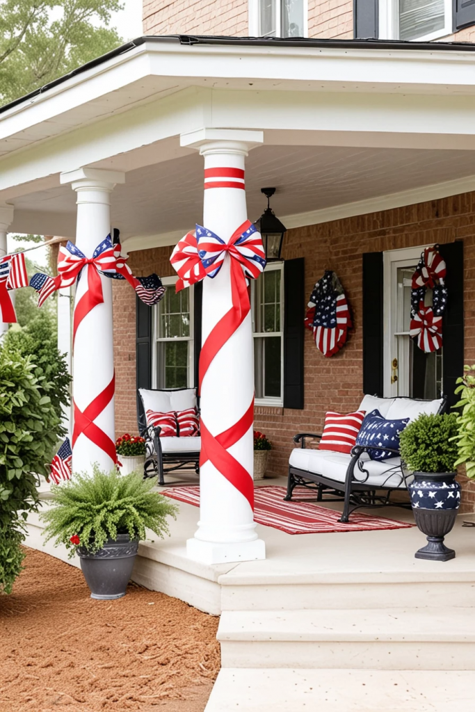 To enhance your patriotic theme, adorn your porch columns with bold ribbons depicting the flag. My recommendation would be to use a wide fabric ribbon with stars and stripes. Each post should be wrapped in a way that gives the impression the ribbon is being wound upward. At the top and bottom, you may secure the ribbon with elegant pins or bows. For a cohesive, grand look, combine with surrounding bunting and patriotic hanging stars.
