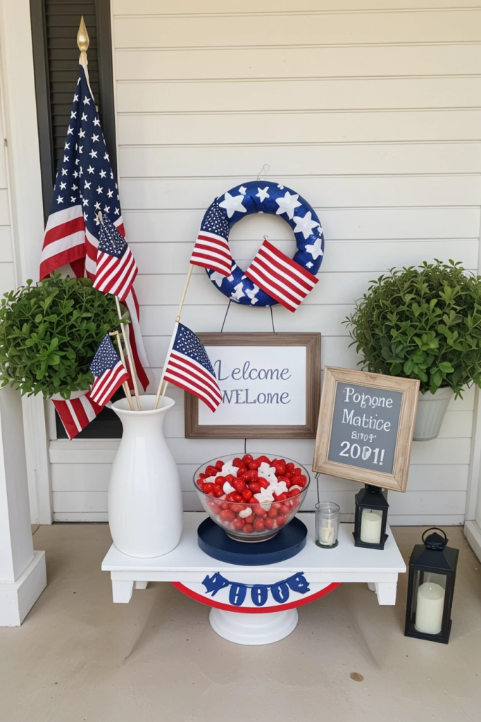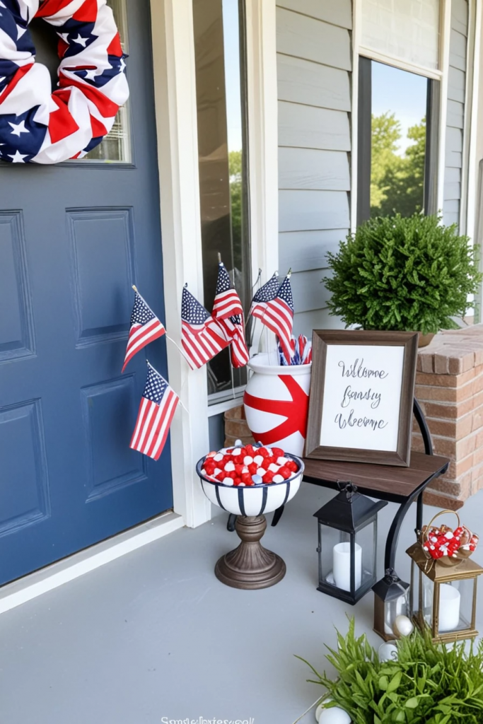 Adding a styled welcome table near your front door is a beautiful way to greet your guests with patriotic charm. For this, you can use a small console or an outdoor table that can be topped with a bouquet of flags, a candy bowl wrapped with red, blue, and white as well as a framed signage that reads ‘Welcome to Our Celebration’. To light up the table during the evening, you can add a few LED candles or lamps and lanterns that will add soft lighting to the table, This will completely enhance the welcoming detail of the table.