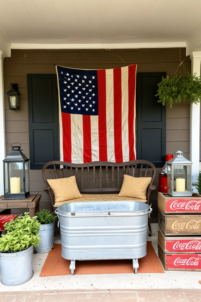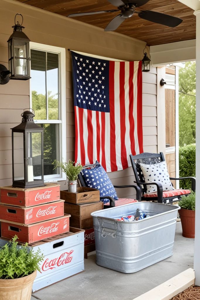 Remember to feel the nostalgia of America by using vintage Americana decor. To celebrate Independence Day, Incorporate antique lanterns alongside old-school Coca-Cola crates, distressed flags, wildflowers in enamel pitchers, and much more. You can also use retro signage or galvanized tubs for drinks. This pays tribute to America’s timeless history while warming up your porch.