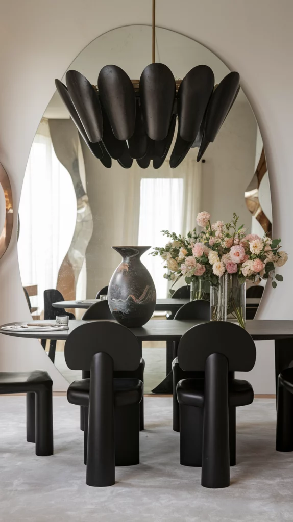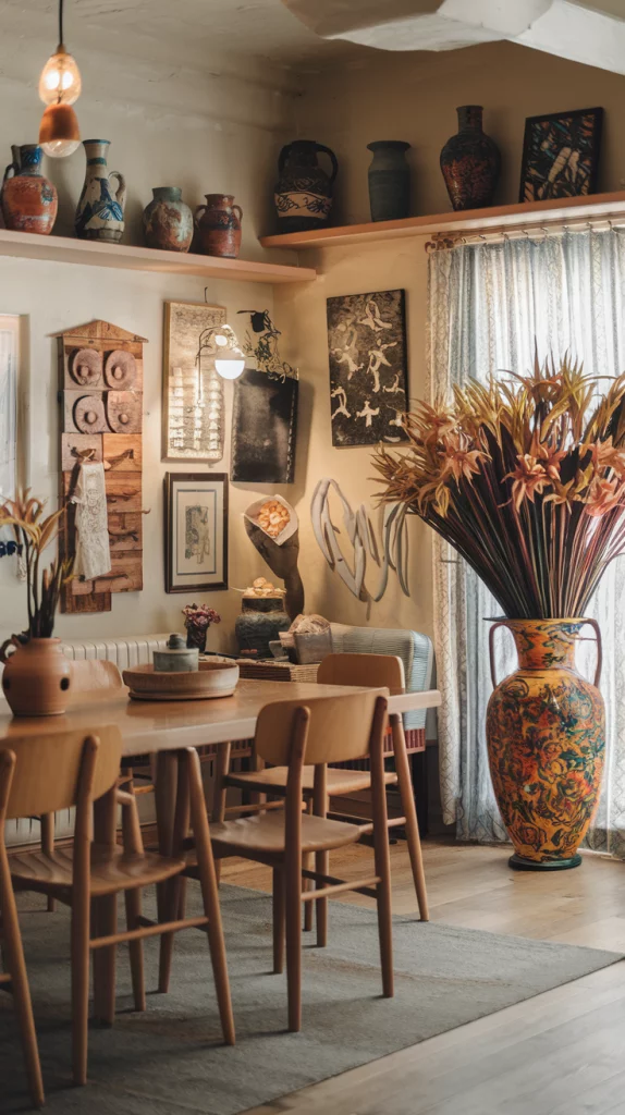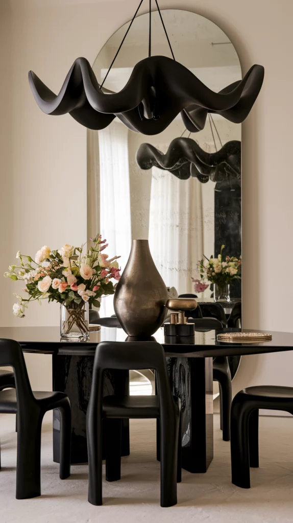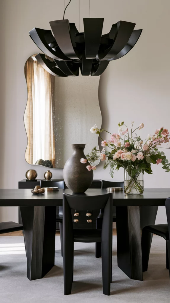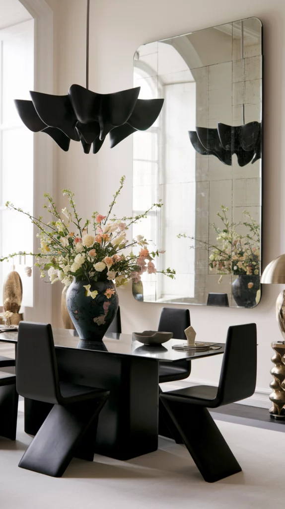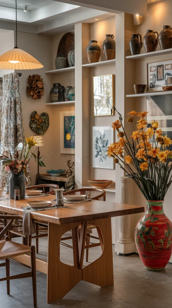 Statement pieces instantly elevate the aesthetic of a dining space. Whether it’s a bold sculptural chandelier, a striking oversized mirror, an abstract centerpiece, or a unique set of chairs, choosing one focal decor element adds personality to the room. A vintage credenza, an artistic vase, or a modern metallic sideboard can also serve as a visual anchor while keeping the space functional.