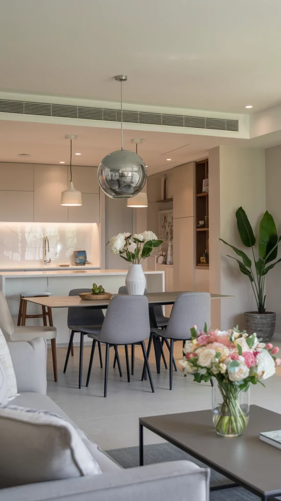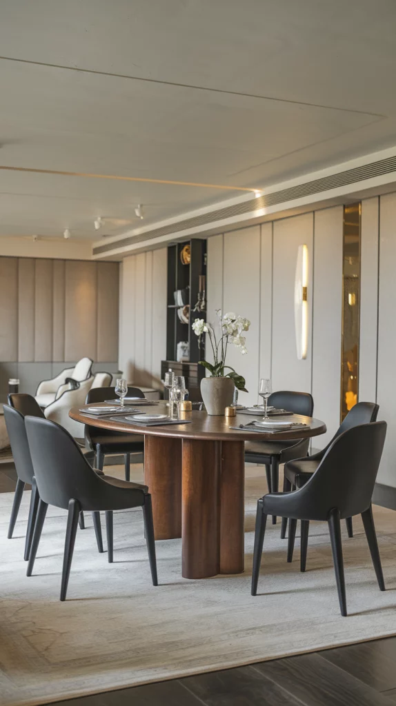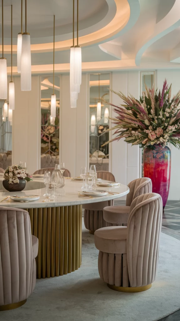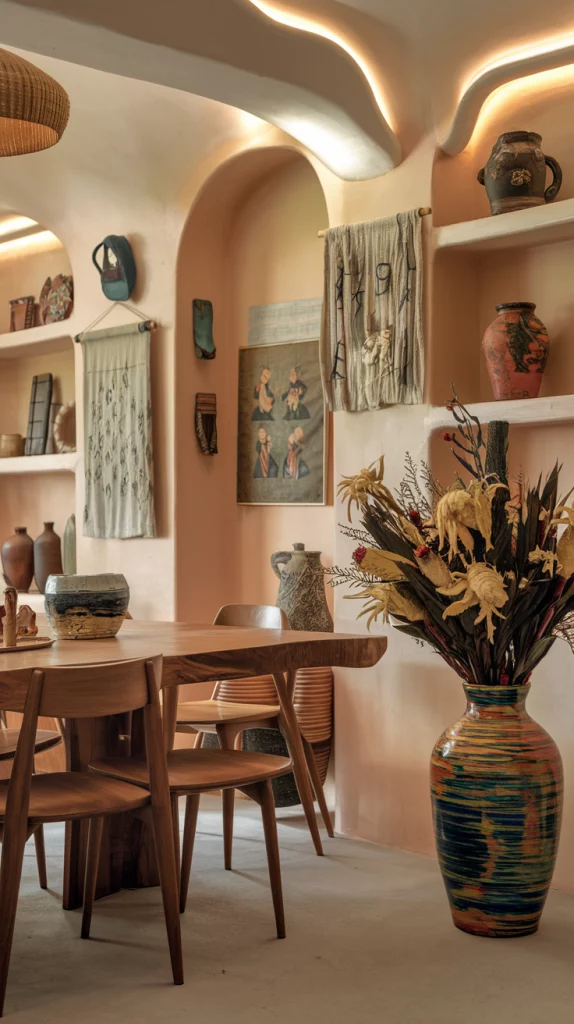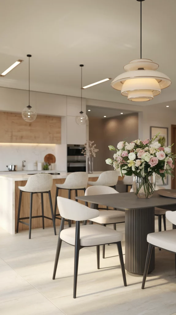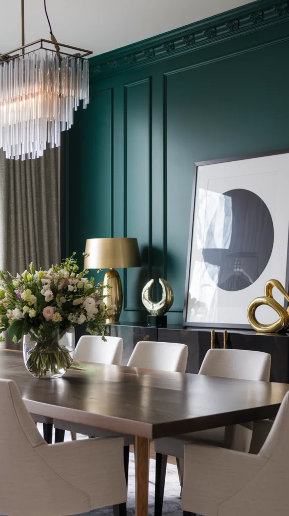 Statement pieces instantly elevate the aesthetic of a dining space. Whether it’s a bold sculptural chandelier, a striking oversized mirror, an abstract centerpiece, or a unique set of chairs, choosing one focal decor element adds personality to the room. A vintage credenza, an artistic vase, or a modern metallic sideboard can also serve as a visual anchor while keeping the space functional.