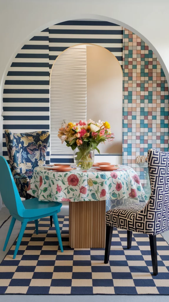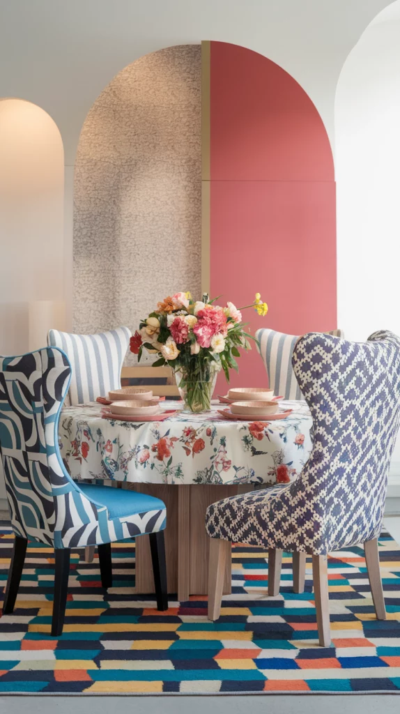 Spring is the perfect time to embrace playful patterns that bring energy and character into the dining space. Whether through vibrant table linens, patterned accent chairs, or geometric rugs, introducing prints can add visual interest. Mixing floral motifs with stripes or abstract prints can create a whimsical yet refined look. Keep the walls and larger furniture neutral to let the patterns stand out without overwhelming the space.