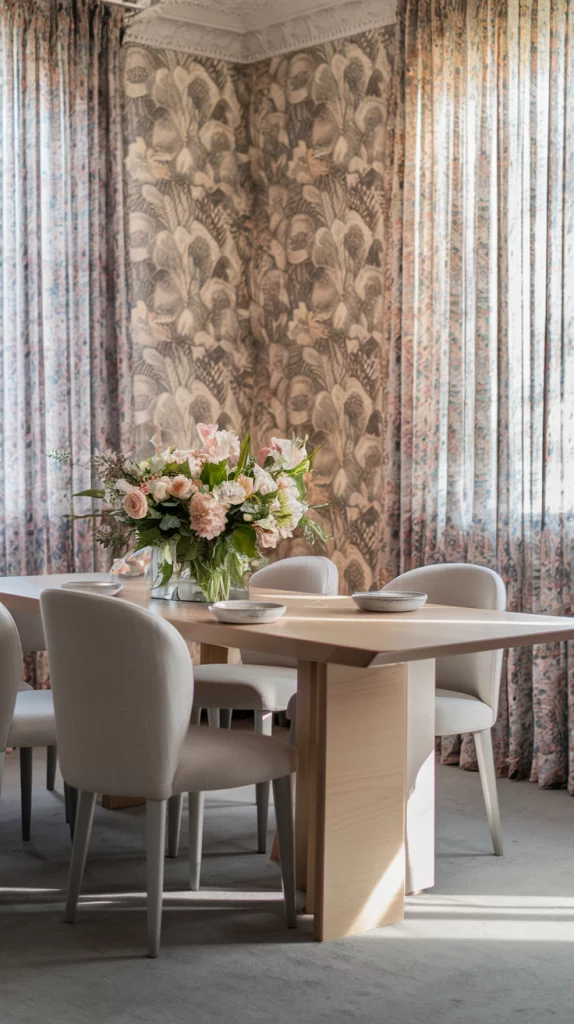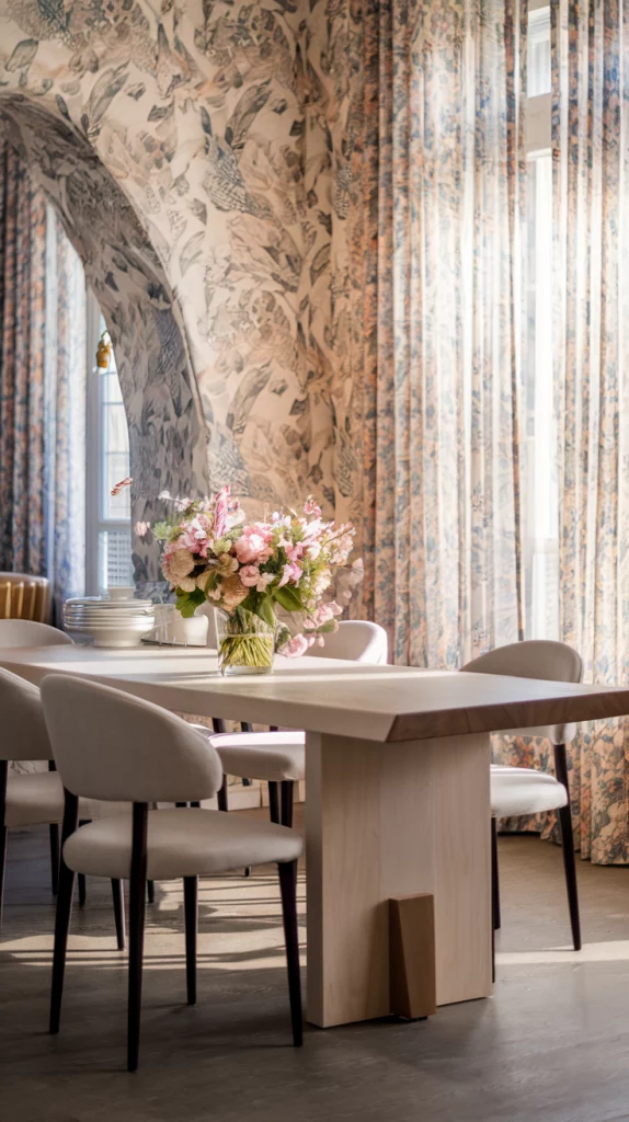 Spring calls for floral accents that bring vibrancy to your dining area. Whether through wallpaper, table linens, or upholstered chairs, floral prints add a lively and sophisticated touch. Opt for delicate floral wallpapers in muted tones for an elegant effect or bold floral drapes to make a statement. Pair floral elements with neutral furnishings to balance the space while keeping it fresh and modern.