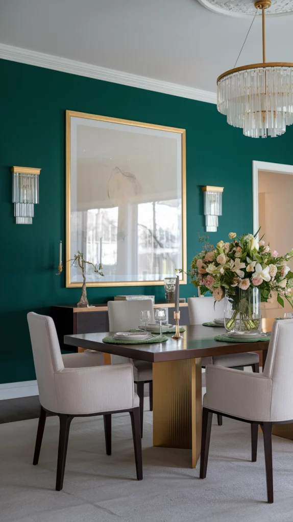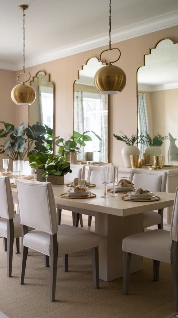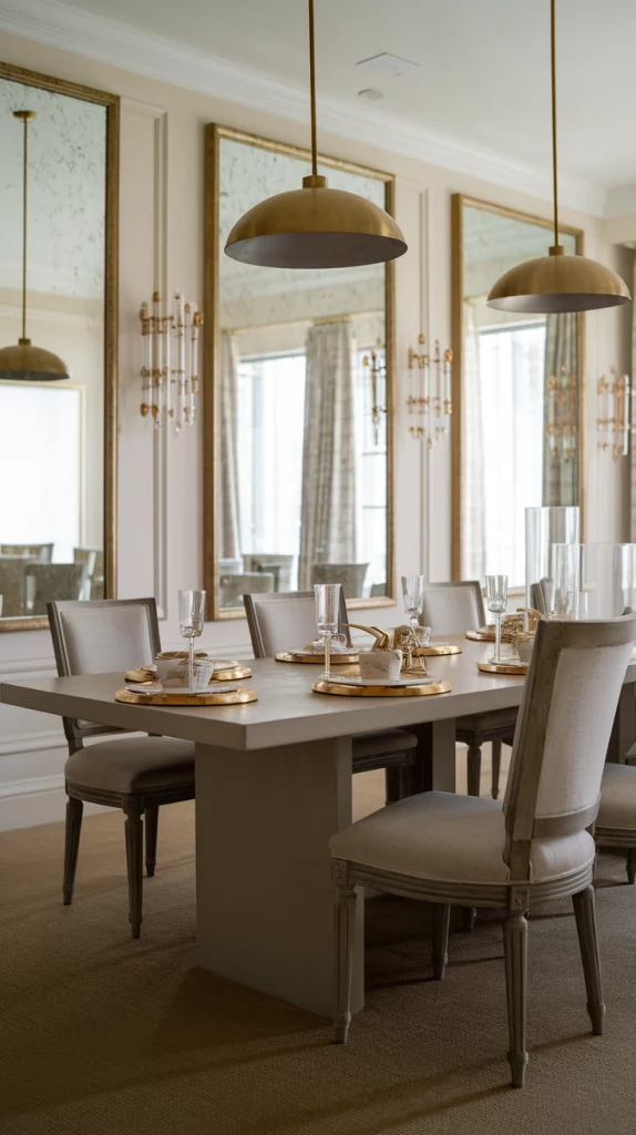 Gold accents add a hint of sophistication without overpowering a dining space. Instead of overwhelming the room with too much shine, use subtle touches like gold-trimmed dishware, brass pendant lights, or gold-accented dining chairs. Even a mirror with a gold frame or gold candle holders can bring a touch of glamour and warmth to a neutral dining room. Pairing gold with soft pastels or natural wood elements keeps the space elegant yet modern.