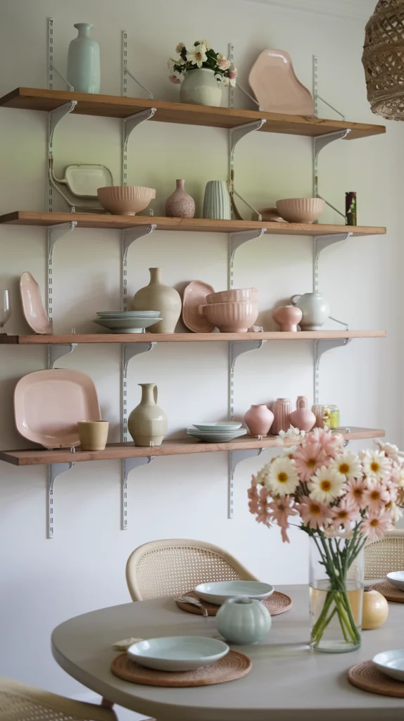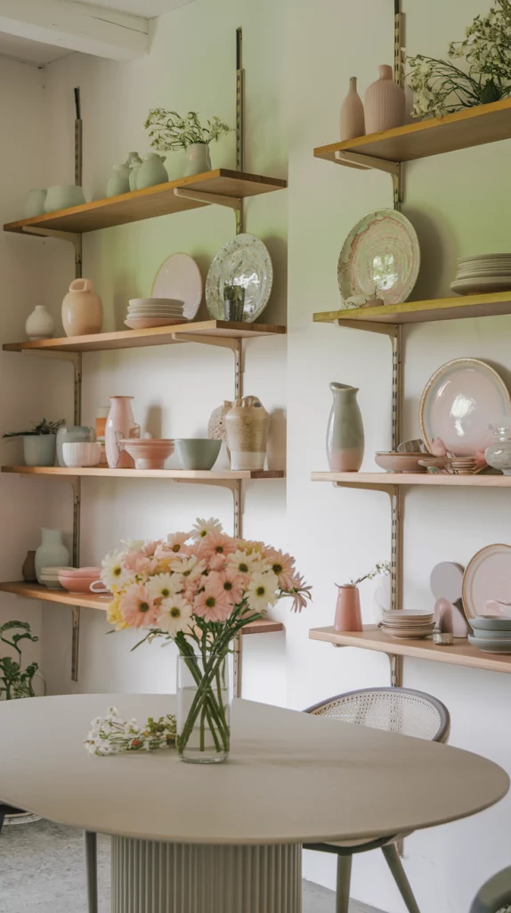 Open shelving adds functionality and aesthetic appeal to a dining room, offering a perfect way to display curated decor pieces, dishware, and seasonal accents. Choose floating wooden shelves for a minimalist look or metal-framed open cabinets for an industrial-modern vibe. Style the shelves with pastel-colored ceramics, glassware, and decorative spring-themed accents like floral vases and woven baskets. Mixing different heights and materials ensures a balanced, dynamic look that feels effortlessly chic.