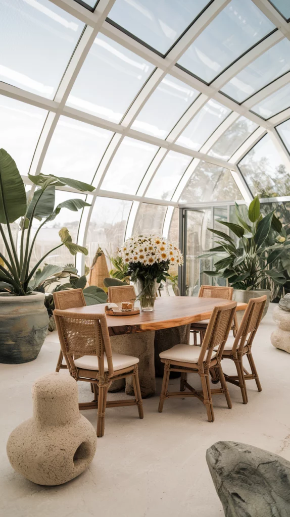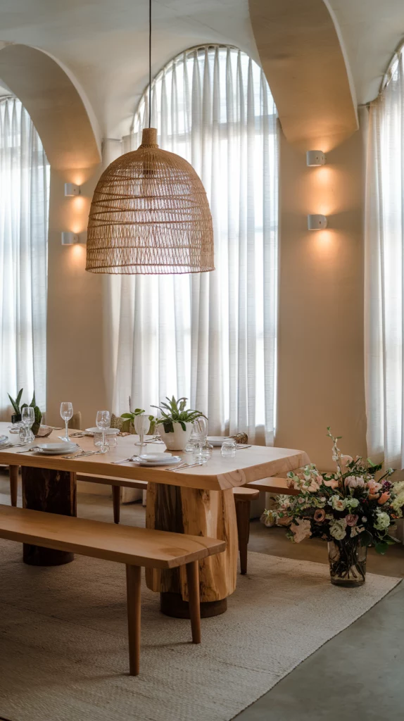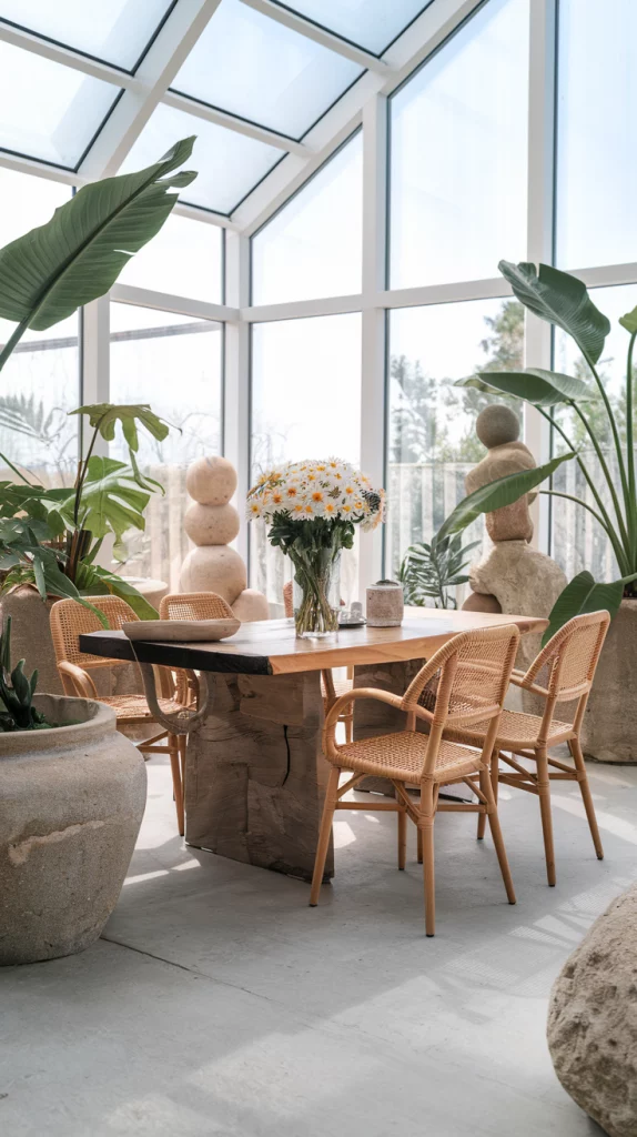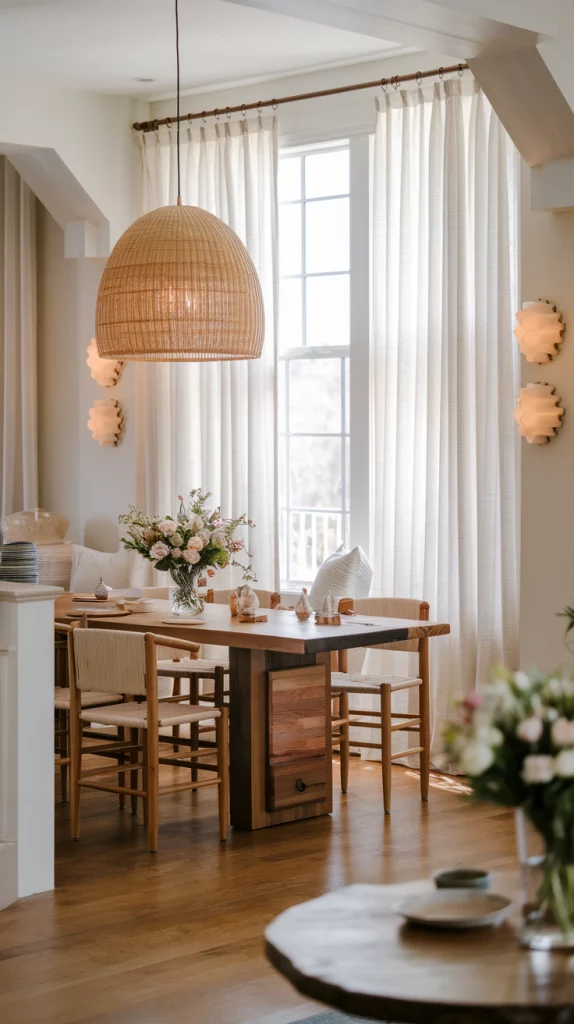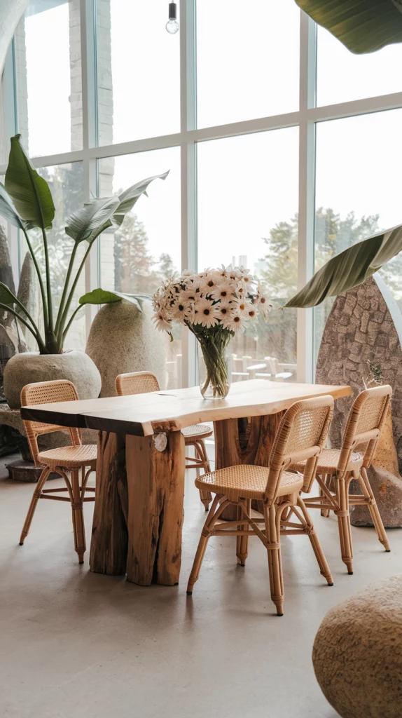 Bringing outdoor-inspired elements indoors is a key spring decor trend. Incorporate woven rattan chairs, stone tabletops, and large indoor plants to mimic the freshness of an outdoor dining experience. Floor-to-ceiling windows with sheer curtains allow natural light to flood the space, creating a bright and breezy ambiance. Adding earthy textures like terracotta vases, linen table runners, and wooden elements further enhances the organic aesthetic.