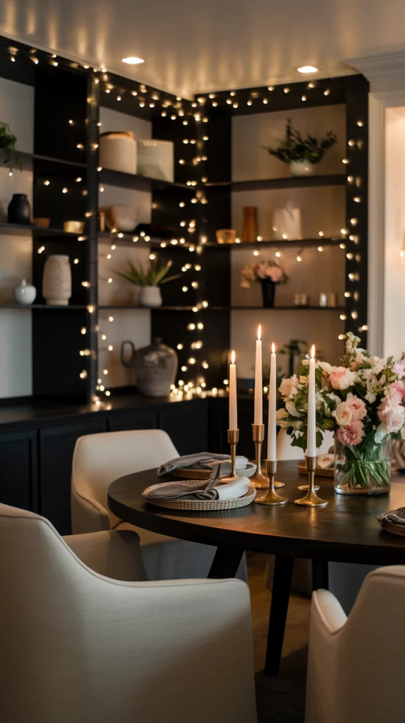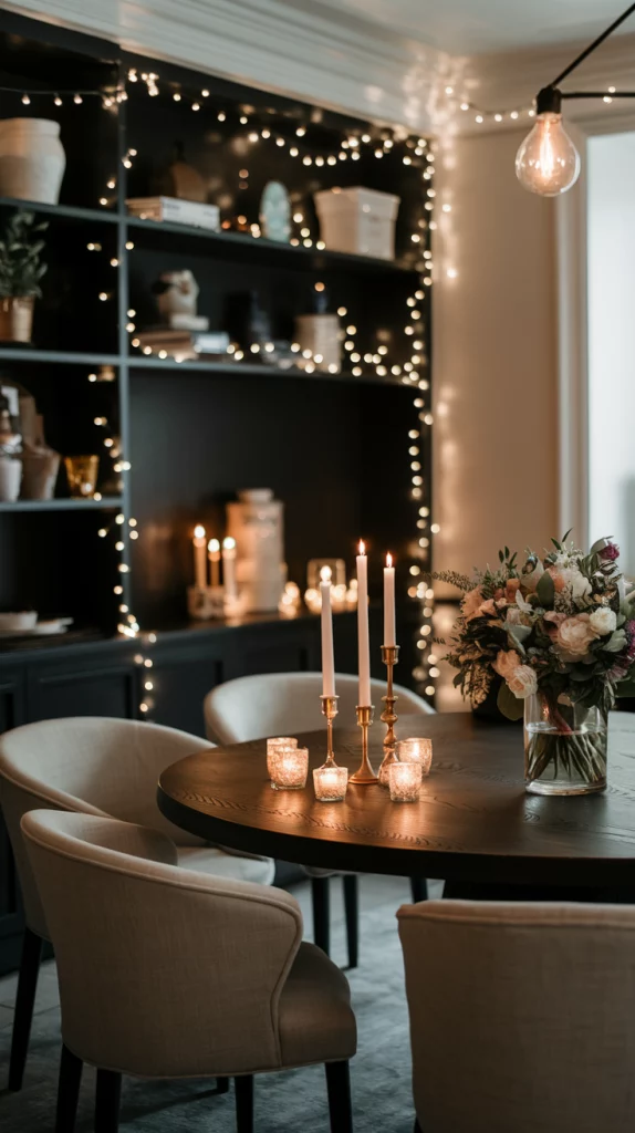 For a romantic and dreamy dining room, fairy lights and candles add a soft, ethereal glow. String delicate fairy lights around a mirror, wall art, or along open shelving to create an enchanting atmosphere. Candles in glass hurricane holders, sculptural candle stands, or vintage brass holders can serve as a beautiful centerpiece for both casual dinners and special occasions. This trend works particularly well in neutral or pastel-themed dining rooms, where soft lighting enhances the warmth and coziness of the space.