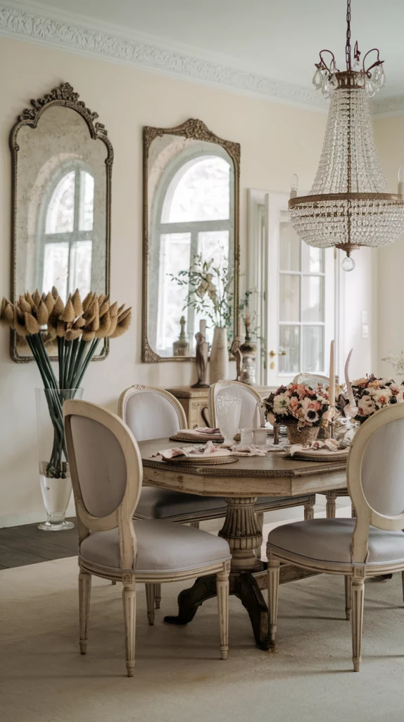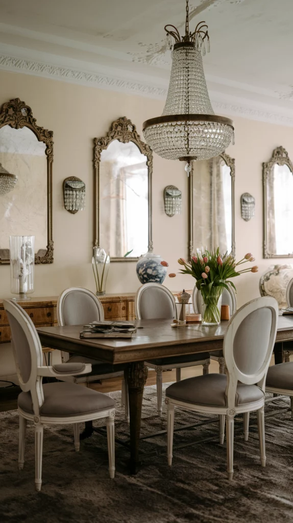 Adding vintage-inspired decor to your dining room creates a timeless and elegant appeal. Incorporate ornate mirrors, antique-style chandeliers, vintage-inspired chairs, or distressed wood tables to bring in a sense of character. Mixing old and new elements, like a classic wooden dining table with modern minimalist chairs, ensures a balanced and curated look. Soft floral table linens and antique dishware complete the charming yet contemporary dining space.