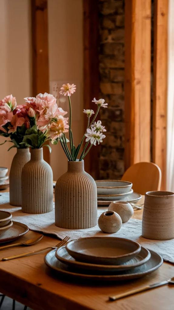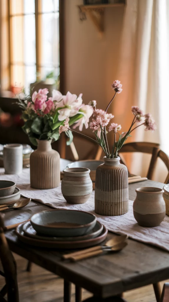 Handcrafted pottery and ceramics bring a warm, artisanal feel to the dining room, making each piece unique and full of character. Spring 2025 highlights organic-shaped dishware, textured ceramic vases, and handmade decorative bowls that add an element of earthy sophistication. Using neutral or pastel-toned ceramics ensures a timeless appeal, while stacking mismatched pottery pieces creates an effortlessly curated aesthetic.
