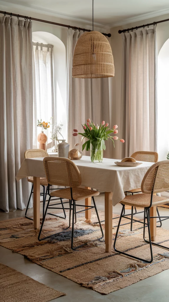 Blending multiple textures adds depth and character to a modern dining space. Soft linen curtains, woven rattan chairs, and cotton tablecloths bring an effortless balance of coziness and refinement. Introduce natural fiber rugs and bamboo placemats to elevate the organic appeal of the decor. Keep the color palette neutral with earthy tones to enhance the textural contrast.