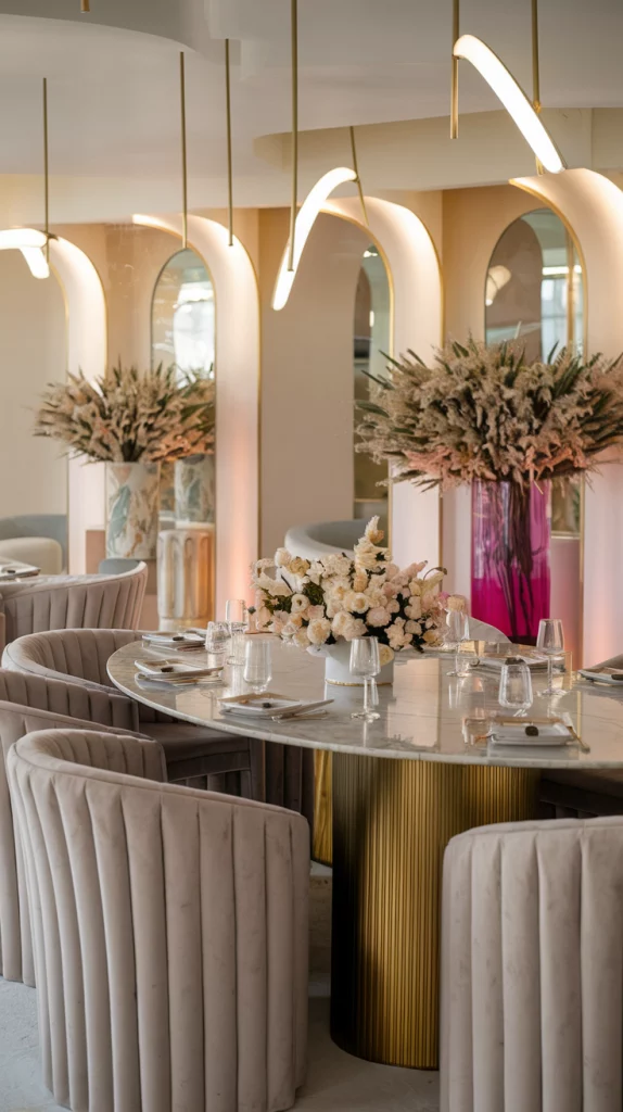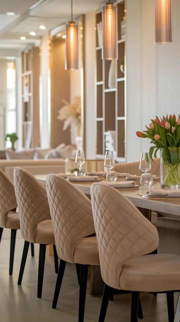 Luxury doesn’t have to mean excess—2025 dining trends embrace understated elegance with refined materials and clean lines. Marble tabletops, textured wall paneling, plush velvet seating, and brushed gold accents create an effortlessly sophisticated look. Keep the space minimal yet warm, focusing on high-quality finishes, soft lighting, and balanced decor. Luxurious simplicity is about choosing timeless elements that enhance the dining experience without overpowering the space.