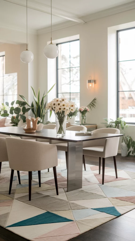 Adding a striped or geometric rug under your dining table can help anchor the space and add a dynamic visual element. Stripes create the illusion of a longer or wider room, making them ideal for small or narrow dining areas. Geometric rugs, on the other hand, introduce a modern and structured feel, complementing minimalist or contemporary interiors. Opt for soft pastels or neutral shades to maintain a light and airy spring aesthetic, while textured wool or jute adds warmth and depth.