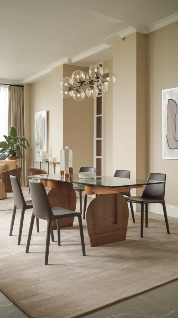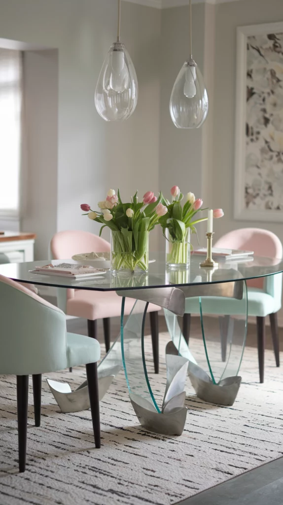 Glass dining tables are a sleek and modern choice that make a dining space feel larger and brighter. Pairing a glass tabletop with sculptural metal or wooden legs adds a contemporary edge while maintaining an airy feel. Transparent furniture works especially well in small dining rooms, where they create an illusion of space. Adding complementary elements like soft pastel dining chairs, metallic accents, or textured rugs ensures the room still feels warm and inviting.