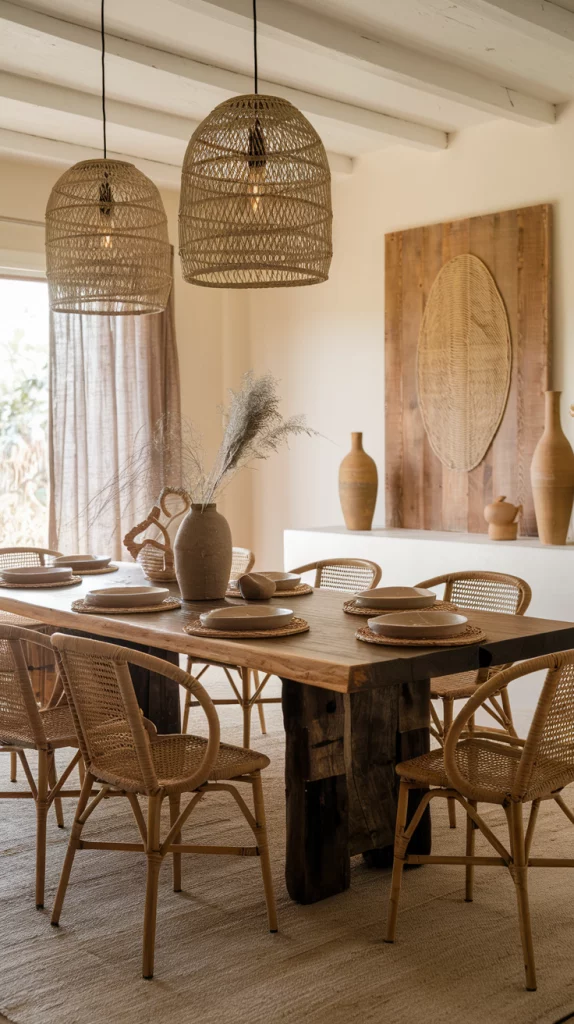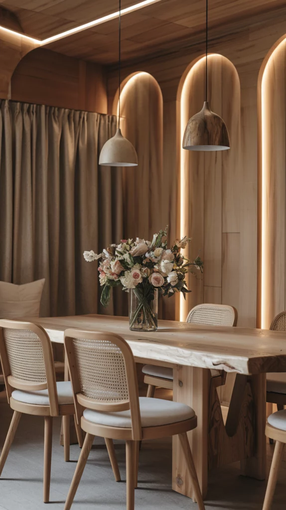 Natural wood remains a key trend in dining room design, offering a warm and timeless look. Opt for solid oak or walnut dining tables, rattan-backed chairs, or wood-paneled walls for added texture. Lighter wood tones create an airy Scandinavian-inspired aesthetic, while darker finishes add depth and sophistication. To enhance the organic feel, pair wood furniture with woven placemats, neutral textiles, and natural stone accents.