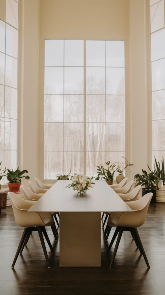 Minimalism continues to be a leading trend, but in 2025, it evolves with a touch of spring-inspired freshness. Clean lines, uncluttered surfaces, and functional furniture define this style. A sleek glass or matte-finish dining table, paired with modern neutral-toned chairs, complements a space designed with simplicity and elegance. Add spring-inspired artwork, soft floral table runners, or delicate ceramic vases to introduce warmth without overwhelming the space.