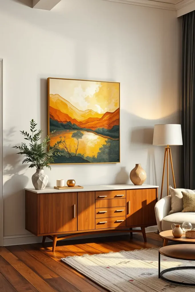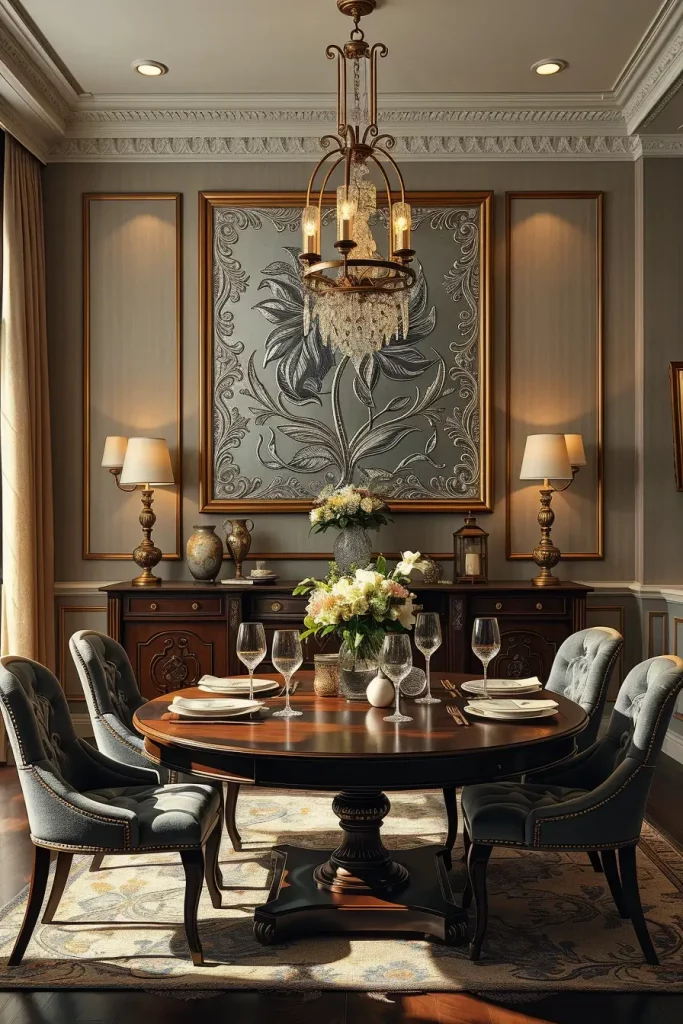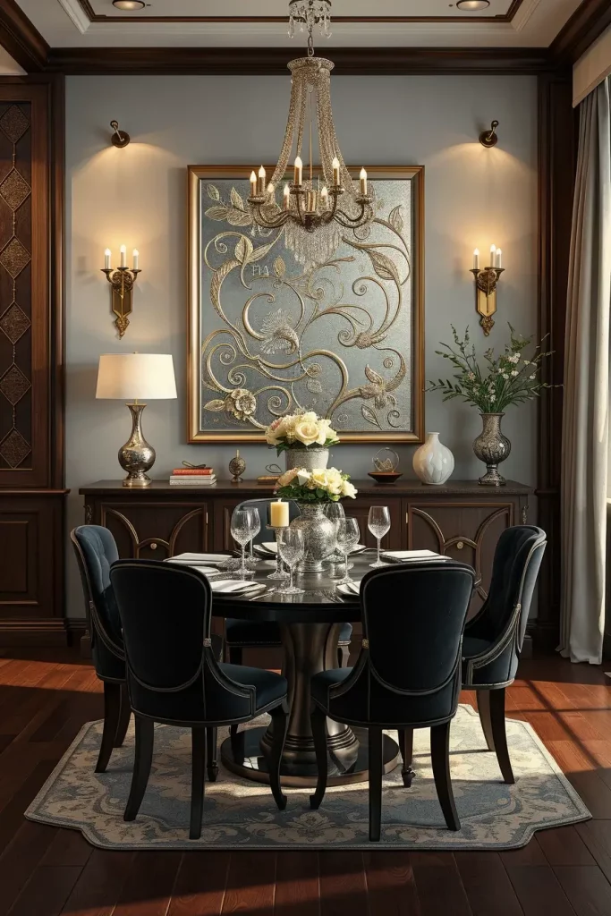 I enjoy placing this kind of artwork above a dark table with brass handles, velvet touch and glass or crystal pieces. Nearby candle holders or pendant lights mirror the shimmer in the artwork, bringing a romantic focus into the space after dark.