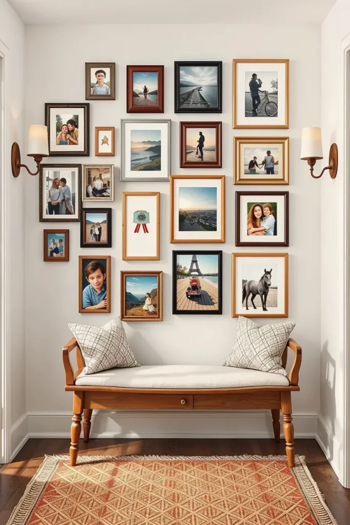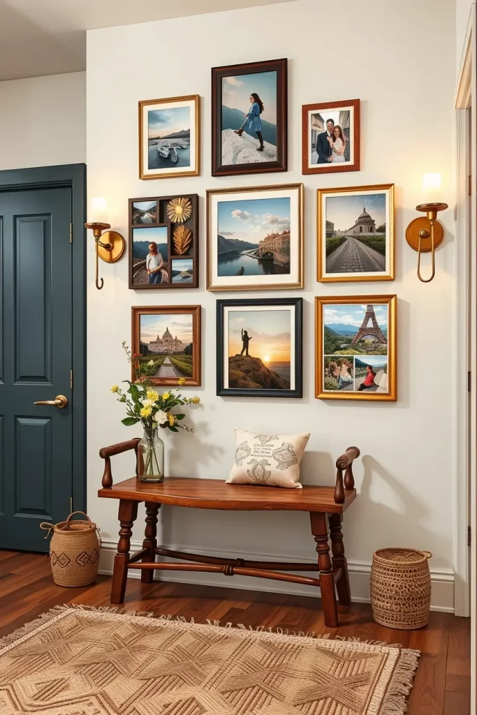 The first thing is to find or create wooden frames that are inexpensive. I either paint some of the boxes in matte black or white or I cover others with fabric and use sparse washi tape and little carving. I set up a template that supports either grid spacing or a looser layout and then position all the frames by hanging them around a main piece such as a personal monogram or canvas print. It looks great when you also have an entryway bench, a woven rug and soft lights on the wall above the collection.