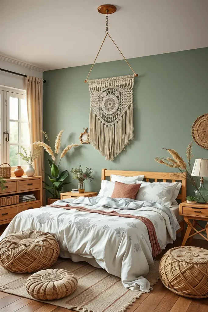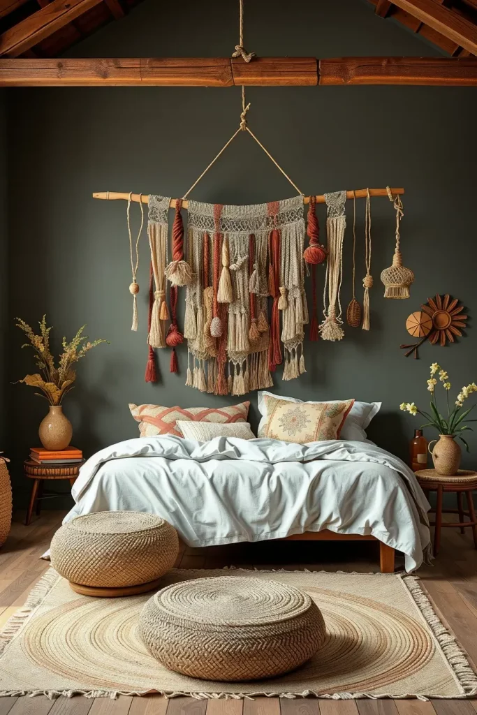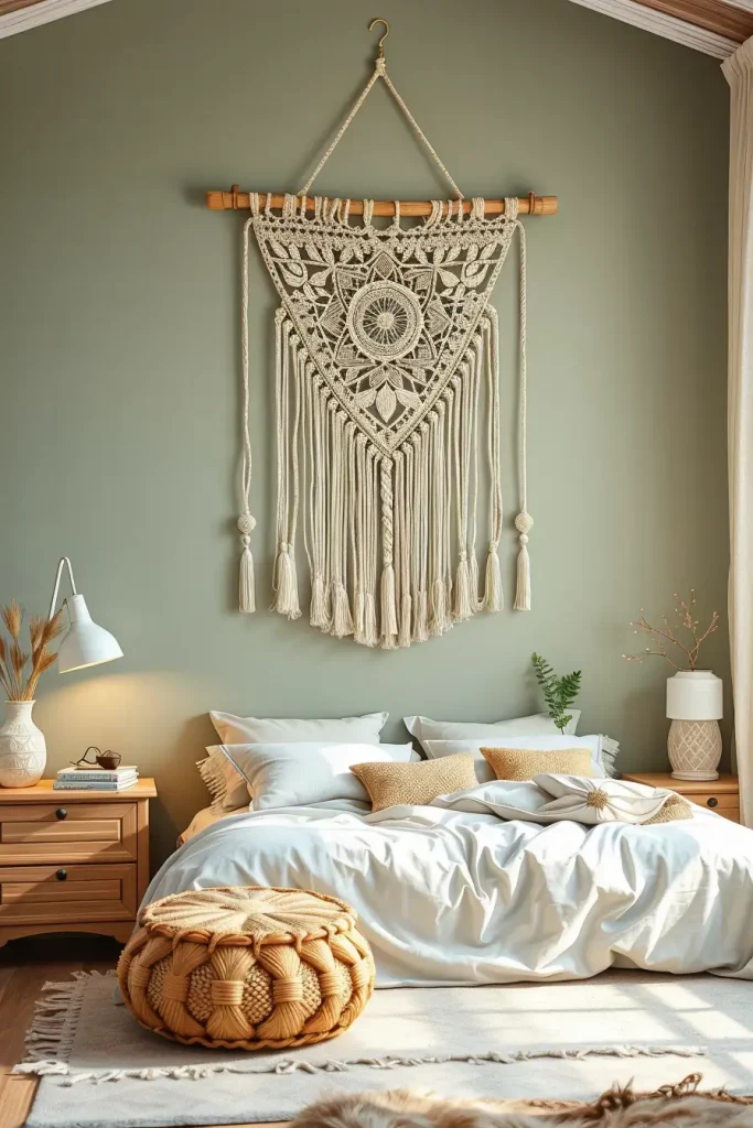 Usually, I use pieces of natural cotton rope and wooden dowels to style diamond, leaf or netted looks. For big areas, I go with multi-step pieces that have fringe detailing. I put these over soft taupe or sage green walls, near light wood furniture, woven poufs and soft cotton bedding to finish the natural style.