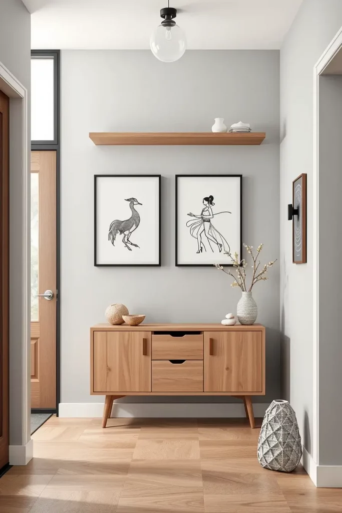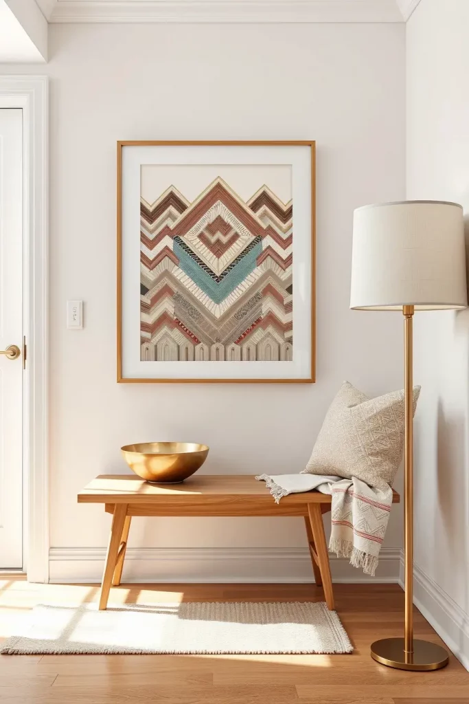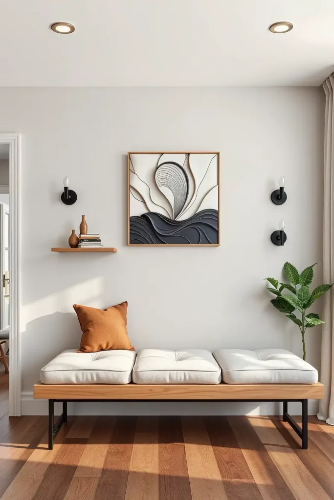 For this style, including items such as shadow boxes, strange shelves or lighting will highlight the design’s shape and depth. Soft neutrals can be nice in furniture, as well such as a light oak bench with simple linen cushions accompanied by black sconces and side tables. This gently adds more style to the wall art.