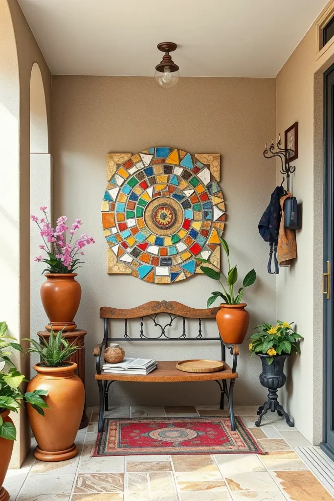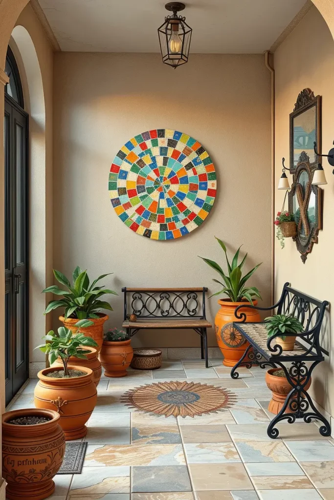 The first step is to put a wood board or concrete base in place and then break up colorful tiles, mirror sections and even crockery with a cloth-wrapped hammer. I sketch out my preferred design which can be sunbursts, flowers or abstract spirals and then I use tile adhesive and grout to secure the pieces for a neat effect. Because they are strong and heavy pieces, I match them with clean decor and few other things. A few items like a wood bench, an iron coat rack or terracotta planters usually look great nearby.