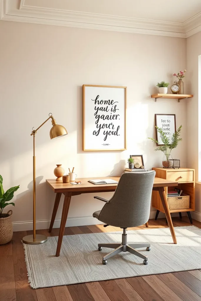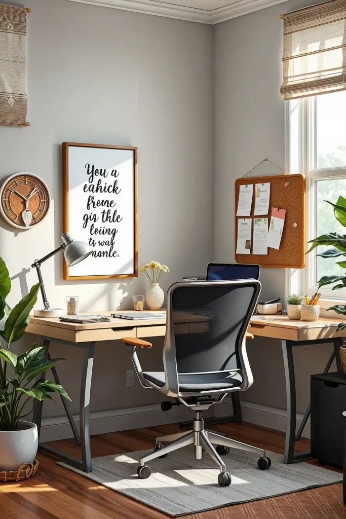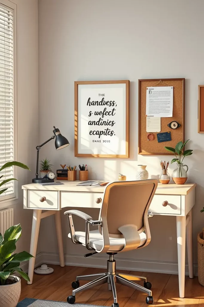 To shape the room, I like the idea of keeping it simple, so use a modern desk, soft lighting and an ergonomic chair. Have a corkboard, a pen holder in ceramic and a frame for a quote that fits your daily schedule. Textured or deckled edge paper gives the appearance of something made by hand.