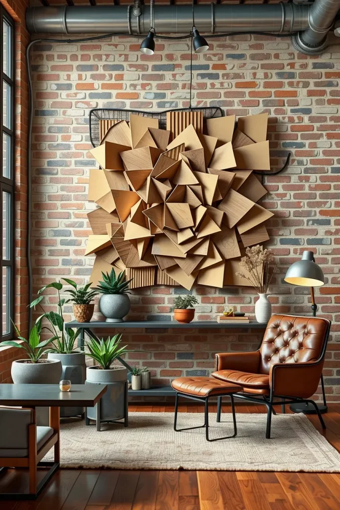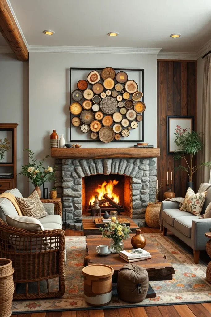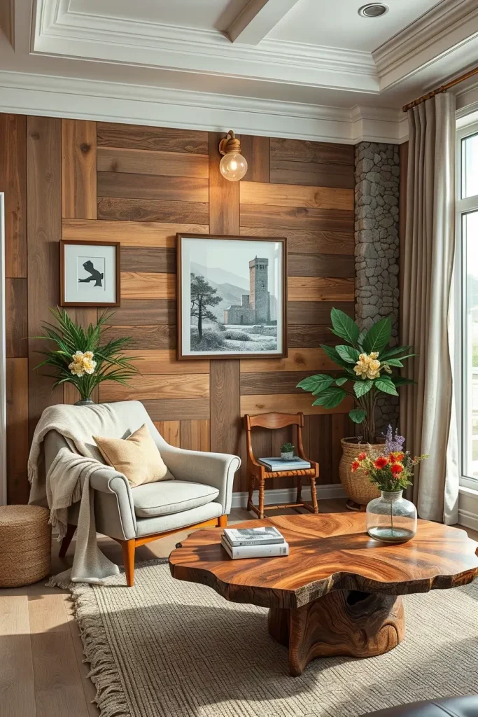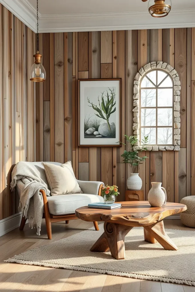 Vertical or chevron arrangements of reclaimed wood panels give a strong backdrop for a balanced composition. Small pieces of stones, for example polished river rocks or slate, might be nice in a stone frame or built right into a floating panel. Furniture inside should reflect nature’s calm: linen chairs, wooden tables with a natural edge and cozy neutral throws would be ideal.