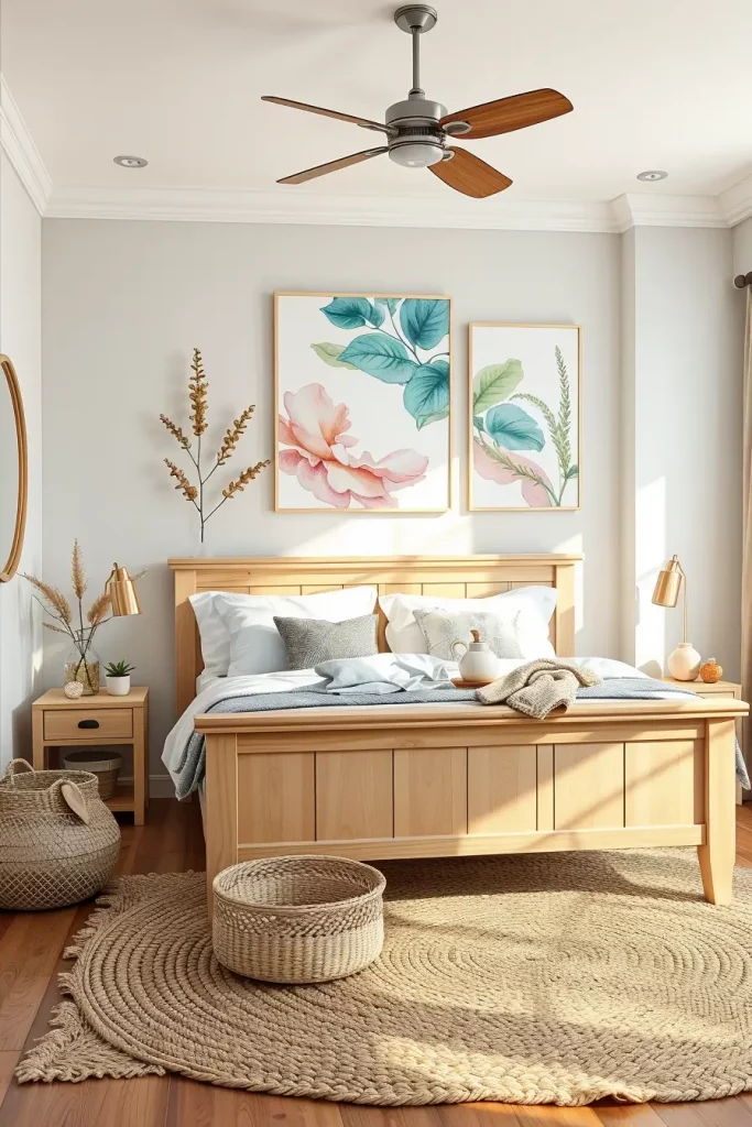 To add a soft touch, I go for light wood furniture, white sheets and also jute rugs or seagrass baskets. All these things add to the carefree feeling that watercolor paints give off. Mounting three panels side by side on the wall gives the wall more balance and a sense of calm.