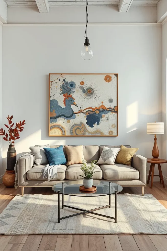 Because of how unique the artwork is, I display it with basic furniture such as a low-profile couch, a clear coffee table and colored cushions. It permits the art to express its message with no words added. A gallery light or a wall-mounted lamp above the artwork enhances the way it looks and keeps the focus on it.