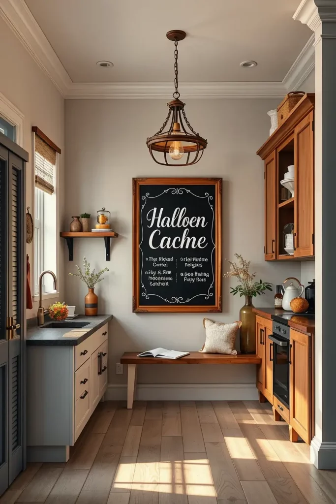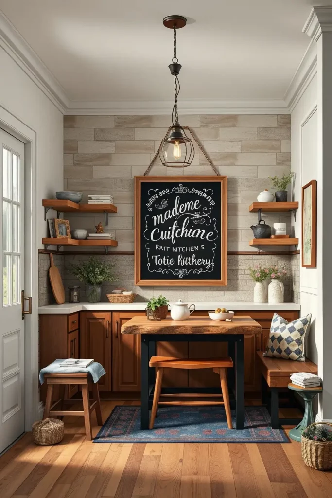 I style the interior using warm wooden shelves, pendant lights and black matte hardware to reflect the board. Having chalk and decorations stored on nearby shelves gives the space an organized look and a small bench helps promote time spent there.