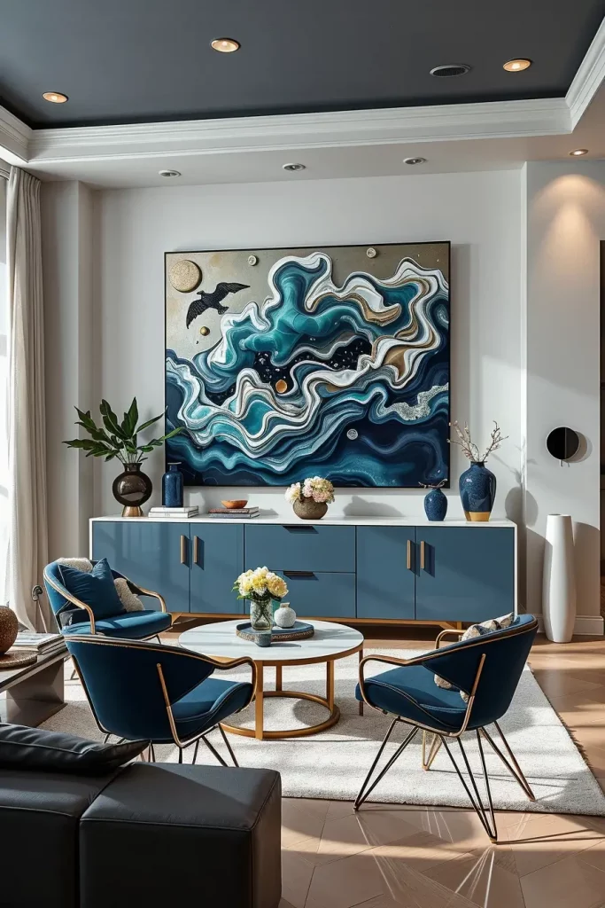 Rather than smooth edges, I select furniture that stands out such as a lacquered console, accent chairs with metal legs and colorful pillows to enhance the boldness of resin art. Having special bowls, vases with clean edges and monochrome displays elsewhere supports the bold presence of the resin piece.