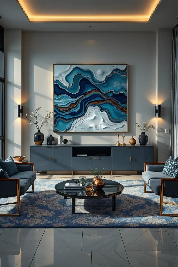 For these paintings, I get a clean canvas, different acrylic colors, a pouring solution and silicone oil to help form attractive cells and swirls. I choose colors that are in the room—for seaside vibes, that’s blue and green and for a warmer effect, burnt orange and gold. The canvas is framed or placed on a floating shelf with led lights shining from behind after it has dried. Having a low-profile sectional sofa, a marble coffee table and chrome accessories around creates a more luxury look.